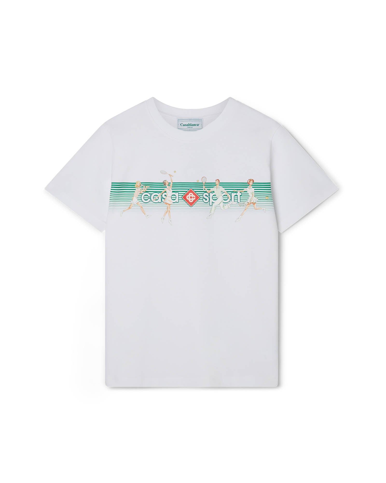 The Playful Stripes screen-printed organic cotton t-shirt features seasonal artwork incorporating the house's signature tennis and Casa Sport iconography. Completed with a classic crewneck, short sleeves and Casablanca Paris branded label, designed for a relaxed fit. 100% organic cotton Colour: white Delicate machine wash Made in Portugal Fits true to size, take your regular size The model is 187cm/6’1 and is wearing a size M