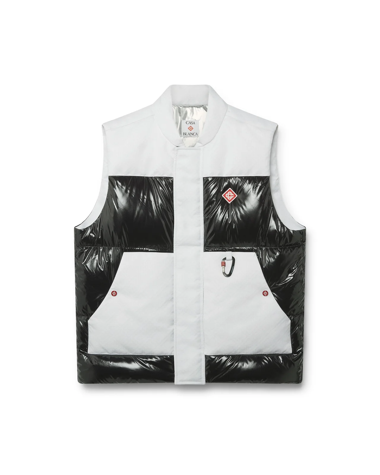 The ripstop down ski vest is a refined outerwear design crafted from CC ripstop and contrasting black down and feather padding. Inspired by Japan's mountainous countryside where ancient temples emerge from deep snowdrifts. Drawing from the dramatic interplay of dark timber structures against brilliant white landscapes and bare winter trees framing frozen waterfalls. - CC ripstop puffer fabric - Main: 100% polyamide - Contrast: 100% polyester - Padding: 80% down 20% feather - Colour: black/white - Specialised dry clean only - Made in Italy - Relaxed fit - The model is 187cm/6'1 and is wearing a size M - Exclusive to casablancaparis.com, Paris Flagship store and selected retailers