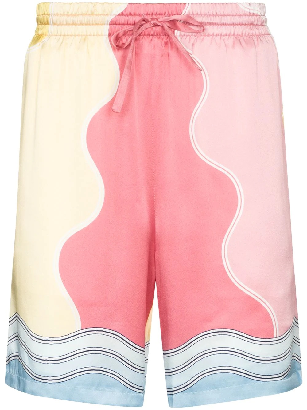Soleil Levant silk shorts Illustrating Casablanca's joyful spirit, these shorts from the label's SS22 collection are covered with an all-over landscape-style print designated Soleil Levant. Their 100% silk construction adds to the piece's cheerful feel. Made in Italy Composition Outer: Silk 100% Lining: Polyester 100% SIZE & FIT Model measurements Height 6 ft 1 in(1.86 m) Bust/Chest 32.67 in(83 cm) Hips 35.03 in(89 cm) Waist 25.98 in(66 cm) Measurement FRONT RISE 12.79 in(32.5 cm) INSIDE LEG 7.08 in(18 cm) FittingInformation This piece fits true to size. We recommend you get your regular size Cut for a loose fit Made with a mid-weight non-stretch fabric Washing instructions Dry Clean Only