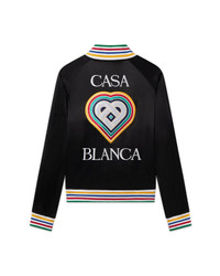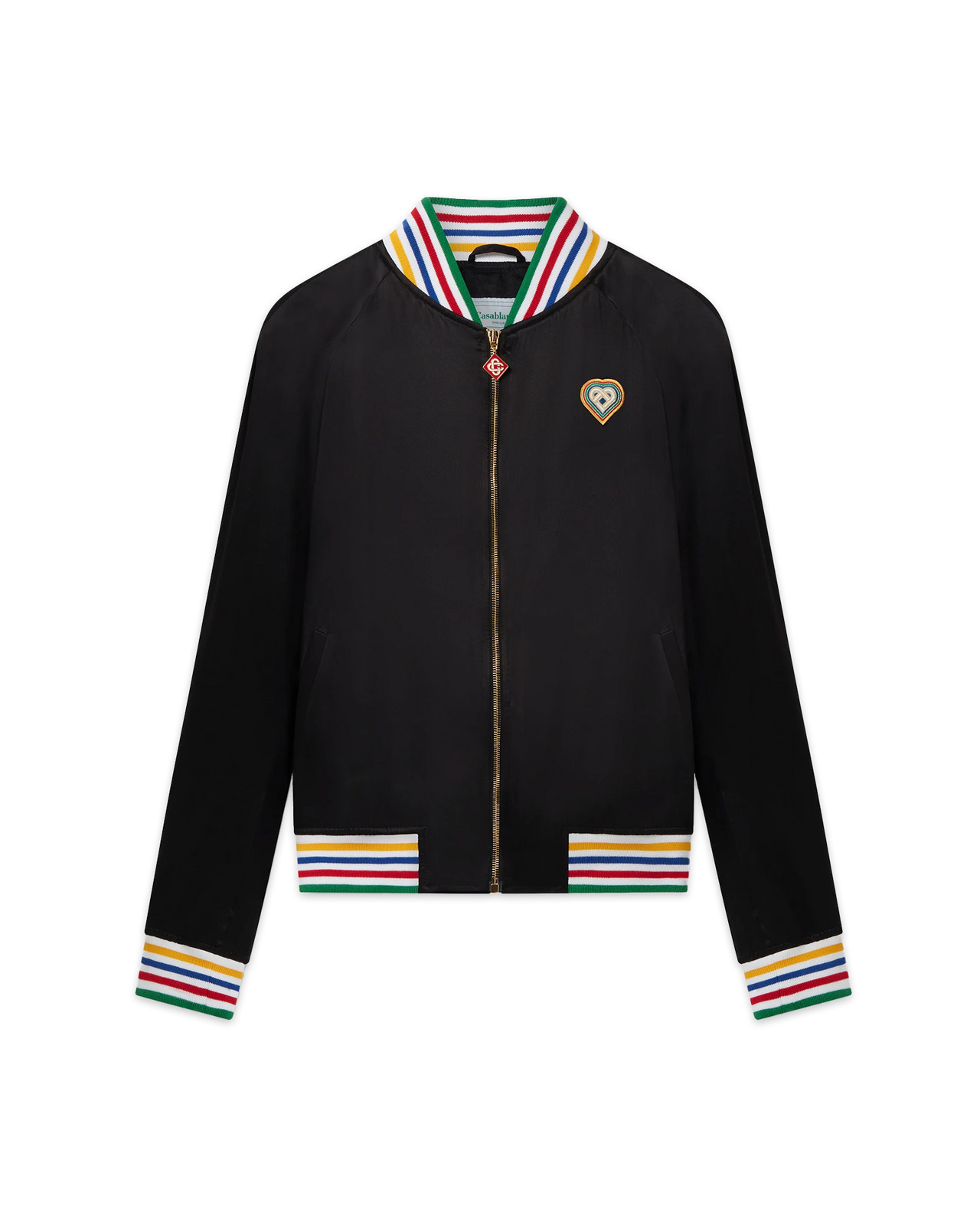 The Souvenir Silk Jacket is a long-sleeved satin silk bomber-style jacket in black, featuring the detailed Casablanca heart logo on the back and front. Completed with contrast striped ribbed cuffs, collar, and hem. - 100% silk - Colour: black - Specialised dry clean only - Made in Portugal - Unisex fit, take your regular size - The model is 187cm/6’1 and is wearing a size M