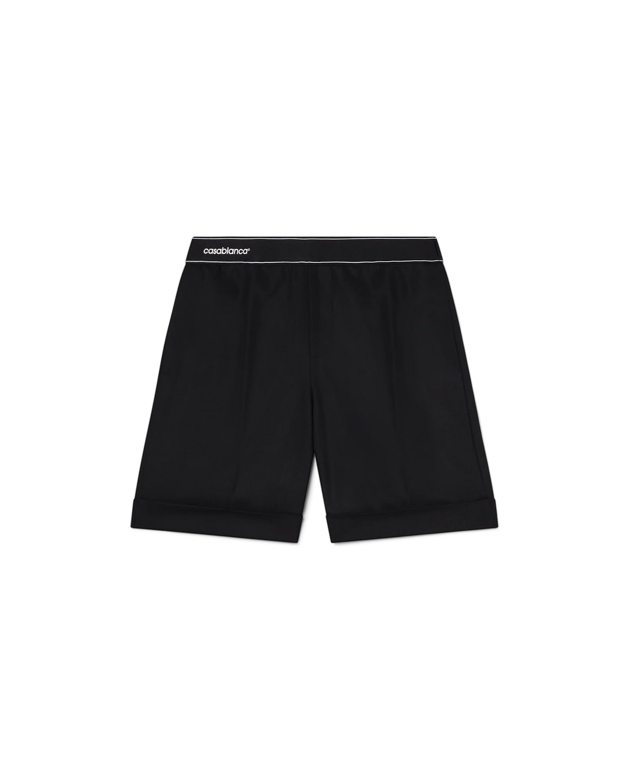 The sports tailoring shorts are a tailored design crafted from a wool blend fabric featuring an elasticated tape waistband with the Casablanca logo. Completed with slanted front pockets, a mock front opening, a welt back pocket, and a turn-up hem. Wool blend fabric 53% polyester 43% virgin wool Colour: black Specialised dry clean only Fits true to size, take your regular size The model is 187cm/6’1 and is wearing a size M