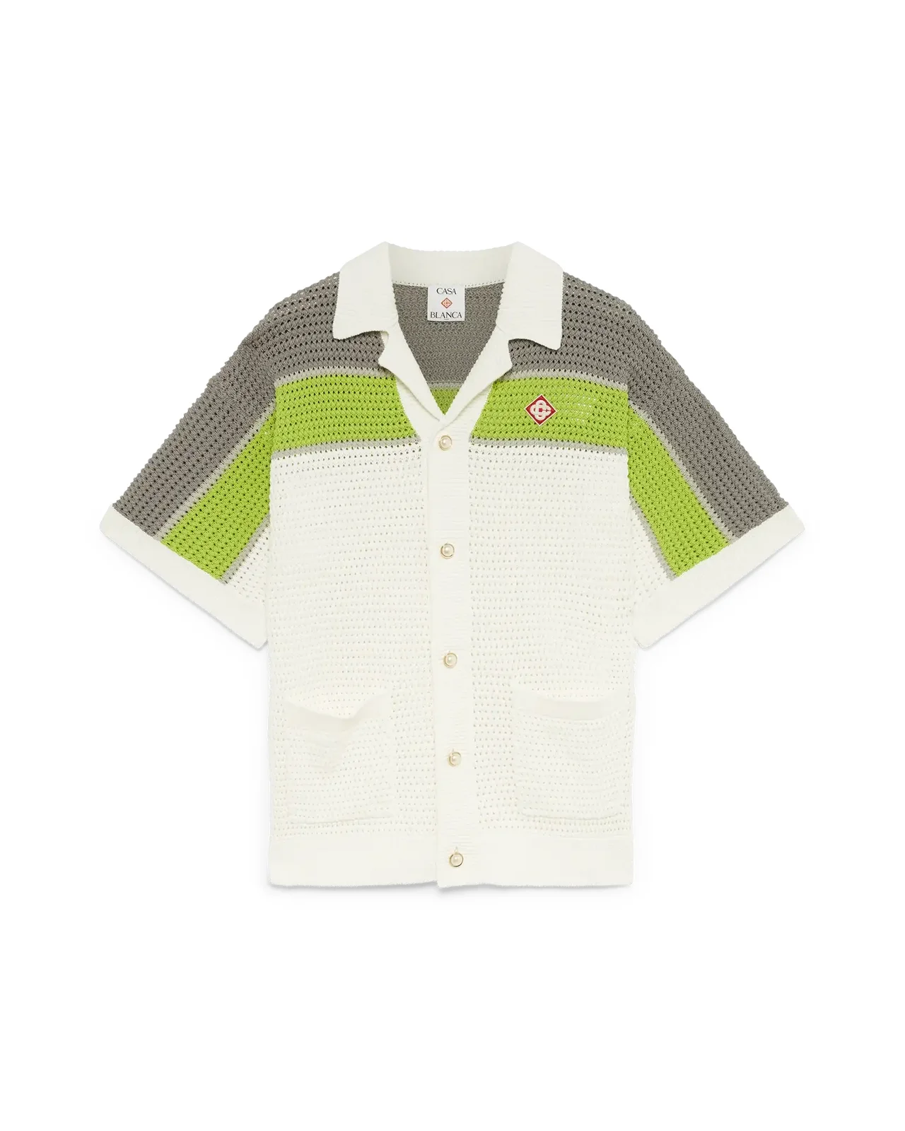 The stripe crochet shirt is a refined classic design featuring the house's warped logo and stripe detail across the shoulders, chest and sleeves, in natural colours. Finished with ribbed collar, cuffs and hem, front button closure, front patch pockets, signature gold rim pearl buttons, and a relaxed silhouette. - Cotton knitted fabric - 100% cotton - Colour: white - Specialised dry clean only - Made in China - Relaxed fit - Exclusive to casablancaparis.com and flannels.com