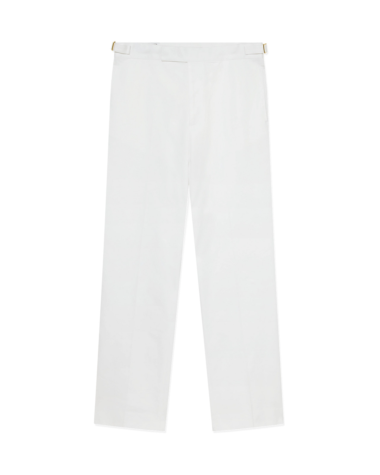 The tailored chino trousers are a straight-leg design, crafted from cotton fabric, and feature a cotton lining. Completed with in-seam pockets, a zip closure, side adjusters with gold-plated buckles, and welt back pockets with button closure. - Cotton fabric - Main: 100% cotton - Lining: 100% cotton - Colour: white - Specialised dry clean only - Made in Portugal - The model is 185cm/6'1 and is wearing a size M