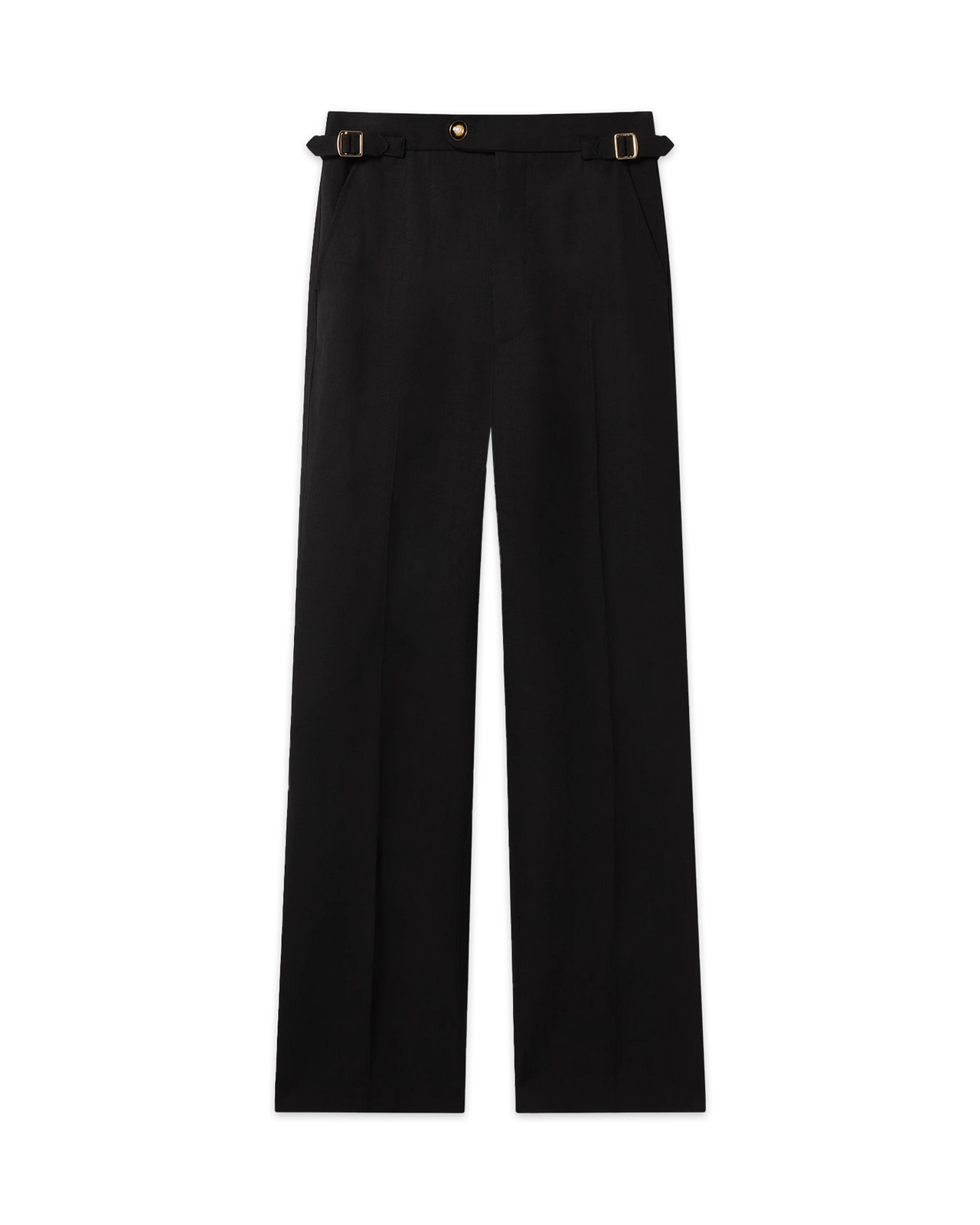 The Casablanca Straight Leg Silk Trouser is a familiar silhouette with a classic fit and slanted pockets. Finished with gold-coloured side adjusters, and the house's signature enamel and pearl button. Silk blend fabric 43% silk 57% viscose Colour: black With side adjusters Specialised dry clean only Made in Portugal Fits true to size, take your regular size