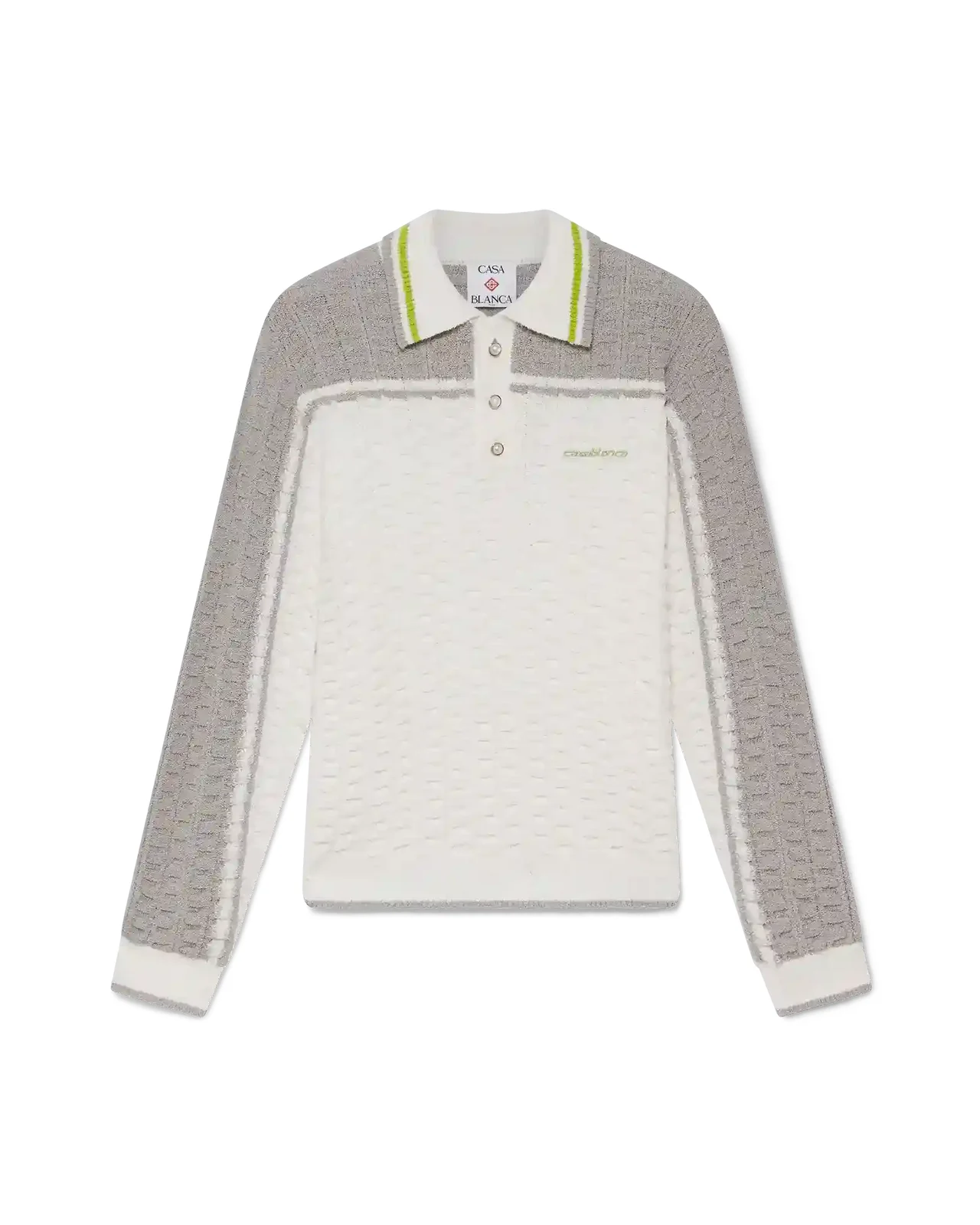 The Tennis boucle long-sleeve polo shirt is a textured design featuring contrast shoulders and outer-sleeves. Completed with a three-button ribbed placket, a collar with striped edge detail, signature Casablanca logo, gold rim pearl buttons, and ribbed cuffs and hem details. - Cotton blend boucle fabric - 72% cotton 27% nylon 1% elastane - Embroidery: 100% polyester - Colour: white - Specialised dry clean only - Made in China - Slim fit
