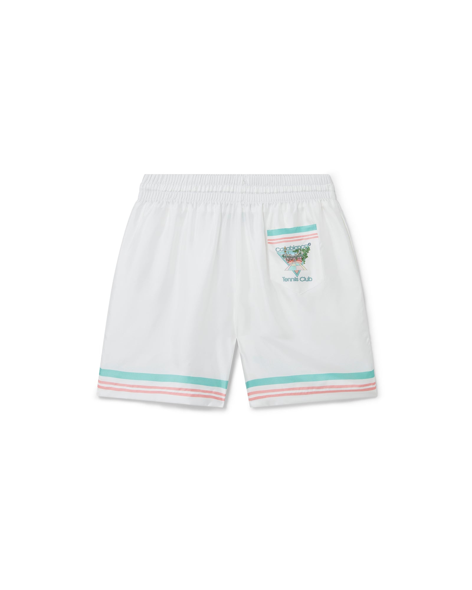 The Tennis Club Icon silk shorts are a louche white style featuring our signature nostalgic artwork on the back pocket. Finished with an elastic waistband, drawstring fastening, and side and back packets to fall loose to above the knee. Printed silk twill fabric 100% silk Tennis Club Icon Pastelle print multicolour Specialised dry clean only Made in Italy Fits true to size, take your regular size