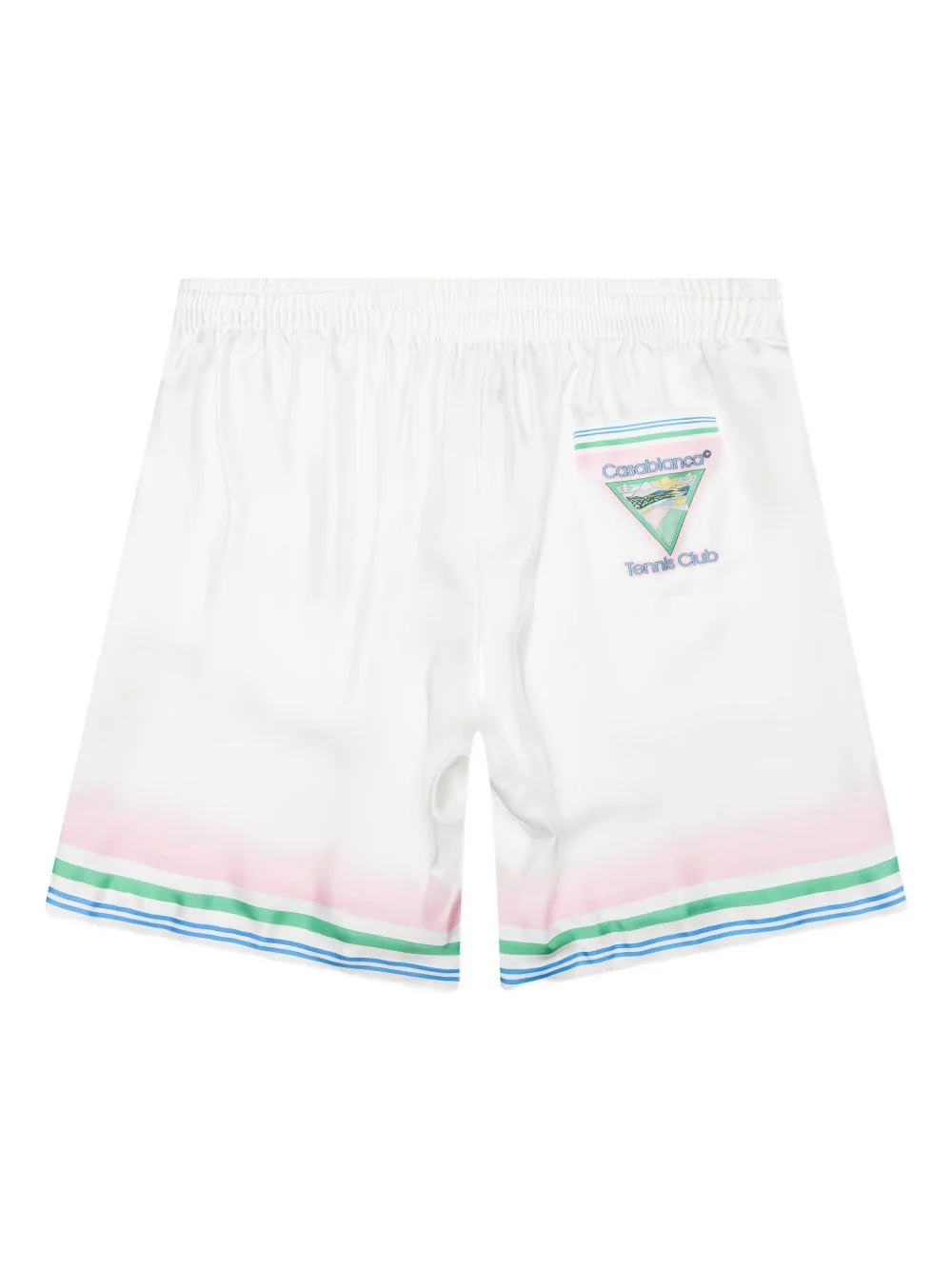 drawstring striped shorts Highlights - White - Silk - Multicoloured striped trim - Tennis club graphic - Drawstring waist - Straight hem Imported Composition Silk 100% Washing instructions Read Manufacturer Guidelines