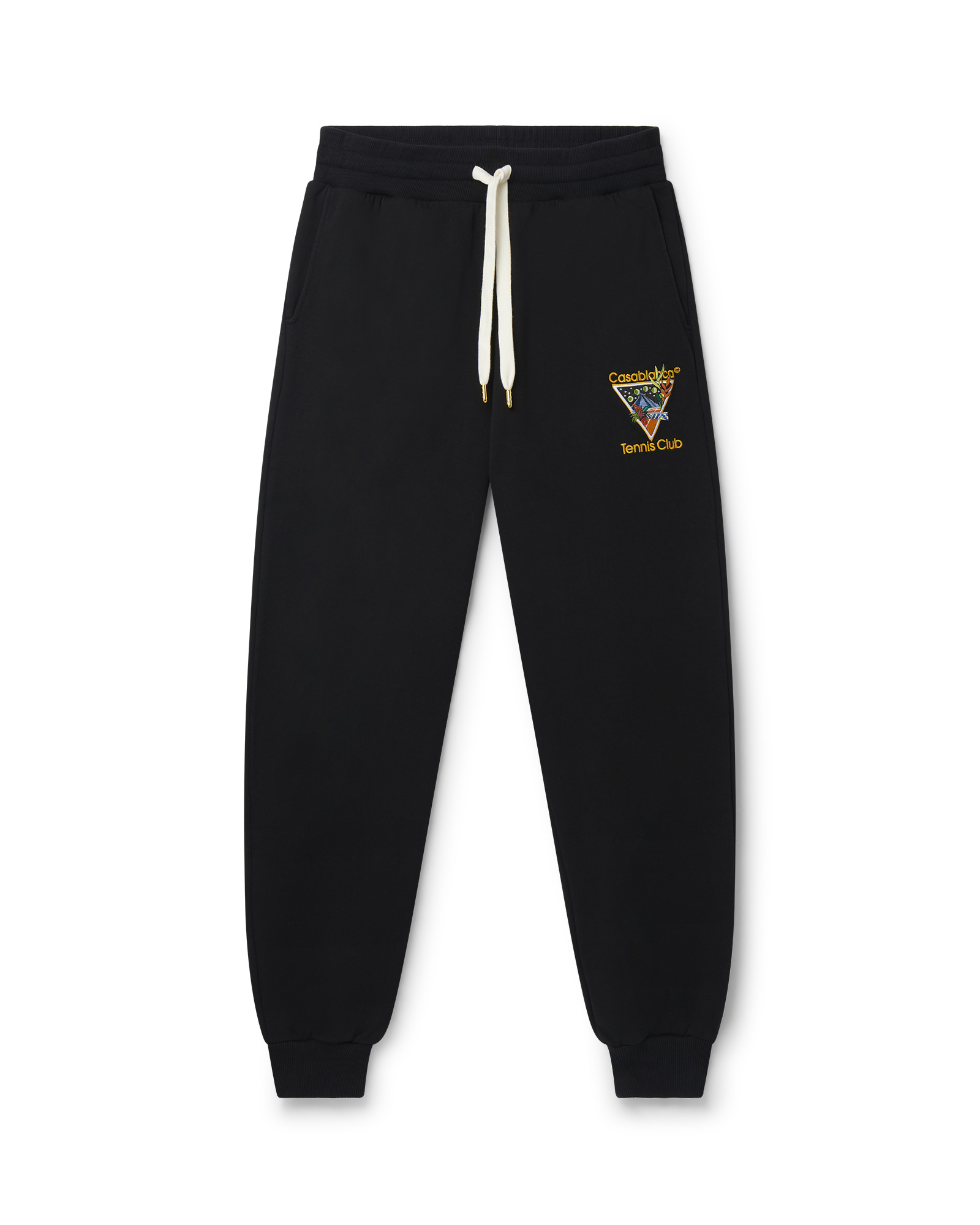 The Casablanca Paris black Tennis Club Icon embroidered sweatpants feature the house's signature artwork reinterpreted for this season. Completed with gold-tipped drawstring fastening, elasticated cuff, side pockets and Casablanca Paris branded label, designed for a classic fit. 100% organic cotton Colour: black Delicate machine wash Made in Portugal Fits true to size, take your regular size