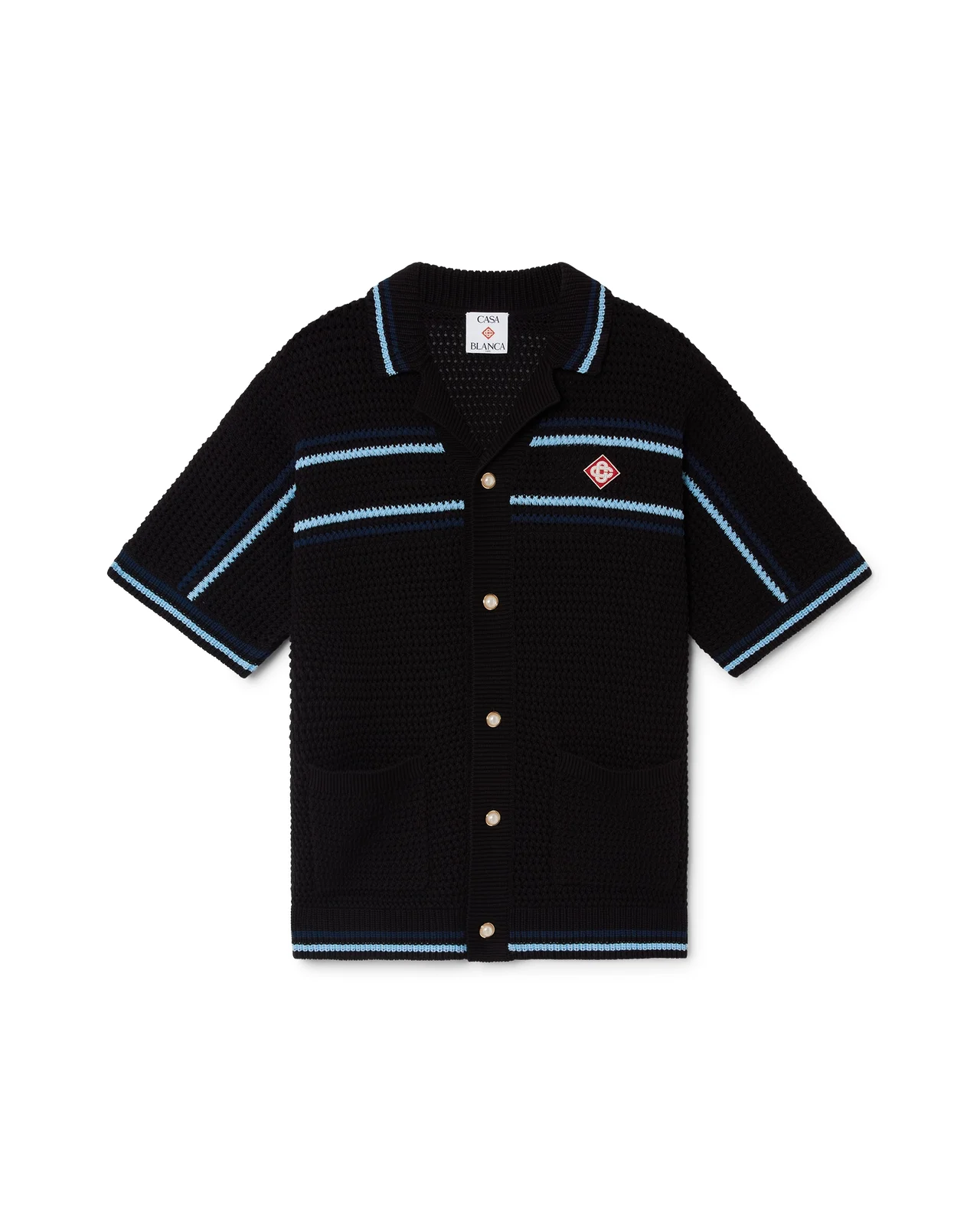 The crochet shirt is a refined classic design crafted from a crochet cotton fabric featuring the signature tennis stripe design across the shoulders, chest and sleeves, in natural colours. Finished with ribbed collar, cuffs and hem, front button closure, front patch pockets, signature gold-rim pearl buttons, and a relaxed silhouette. - Cotton knitted fabric - 100% cotton - Colour: black - Specialised dry clean only - Made in China - Relaxed fit - Exclusive to casablancaparis.com and our Paris flagship store