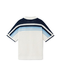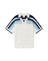 The crochet shirt is a refined classic design crafted from a crochet cotton fabric featuring the signature tennis stripe design across the shoulders, chest and sleeves, in natural colours forming a gradient effect. Finished with ribbed collar, cuffs and hem, front button closure, front patch pockets, signature gold rim pearl buttons, and a relaxed silhouette. - Cotton knitted fabric - 100% cotton - Colour: white/blue - Specialised dry clean only - Made in China - Relaxed fit - Exclusive to casablancaparis.com and our Paris flagship store