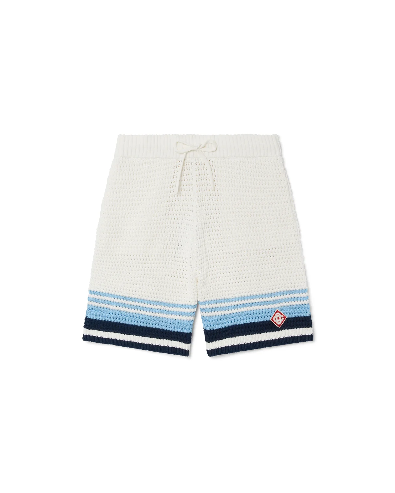 The crochet shorts are a refined soft textured design crafted from a crochet cotton fabric, featuring the signature tennis stripe design in natural colours forming a gradient effect. Finished with a ribbed elasticised waistband with drawstring fastening, side pockets and a relaxed silhouette. - Cotton knitted fabric - 100% cotton - Colour: white/blue - Specialised dry clean only - Made in China - Relaxed fit - Exclusive to casablancaparis.com and our Paris flagship store