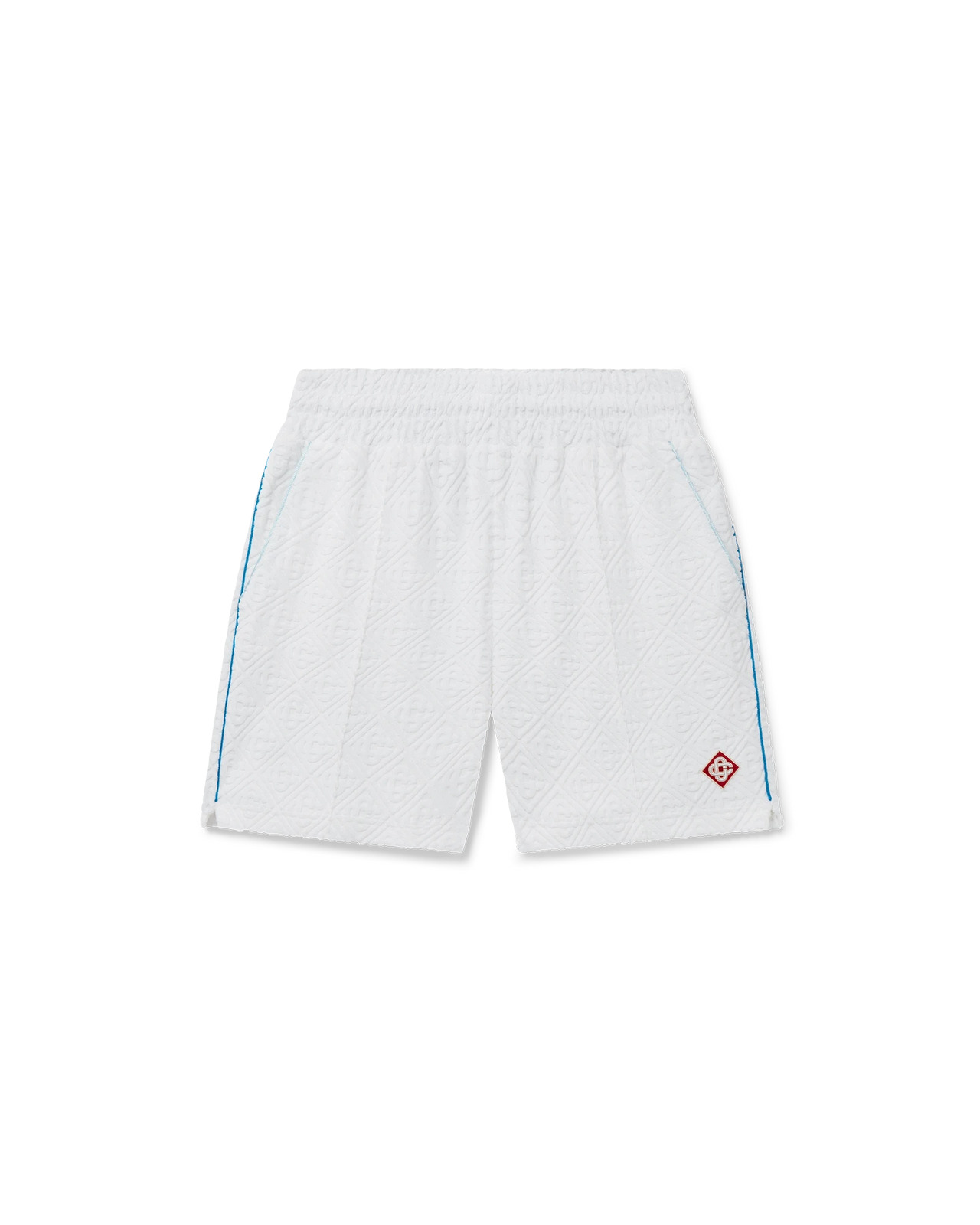 The Monogram towelling shorts are a classic design crafted from a monogram towelling fabric featuring the house's diamond logo. Completed with an elasticated waistband, internal gold-tipped drawstring fastening, pin tuck seams down the front, a back pocket with zip closure, slanted side pockets, and piping details on the back and front pockets and down the sides. - Monogram towelling fabric - 86% cotton 13% polyamide 1% elastane - Colour: white - Delicate machine wash - Made in Portugal - The model is 185cm/6'1 and is wearing a size M - Exclusive to casablancaparis.com and selected retailers