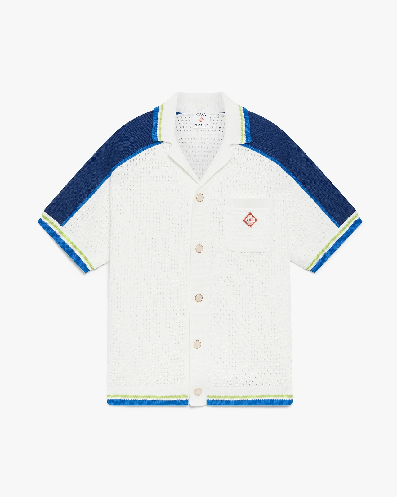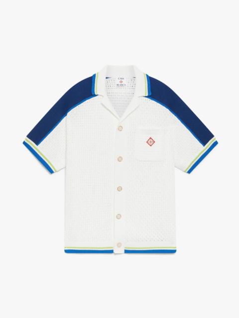 The white & blue short-sleeve crochet shirt is a refined design crafted from an open weave construction featuring stripe detail across the shoulders and sleeves. Completed with a Cuban-style collar, button closure, the house's signature gold rim pearl buttons, ribbed cuffs, hem, and collar with striped edge detail, and a breast pocket. - Cotton blend fabric - 52% cotton 48% polyester - Colour: white/blue/yellow - Specialised dry clean only - Made in China - The model is 188cm / 6'2 and is wearing size M - Relaxed fit