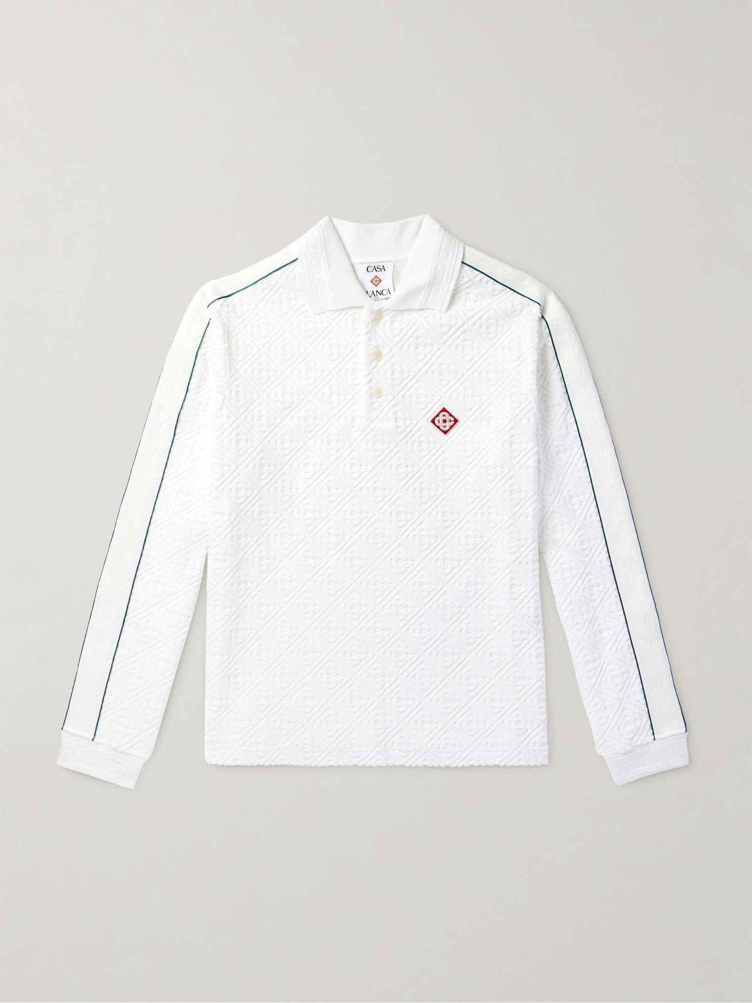 Casablanca's refined sportswear is inspired by the statement pieces worn at members-only clubs and resorts. Appliqued with a signature diamond logo, this polo shirt is made from soft cotton-blend terry - jacquard-woven with its monogram - and has contrasting piping along the sleeves. Size & Fit - Fits true to size. Take your normal size - Designed for a loose fit - Lightweight, stretchy fabric - Model is shown wearing a M - Model measures: chest 38"/ 96cm, height 6'0"/ 183cm Details & Care - White cotton-blend terry-jacquard - Button fastenings - 86% cotton, 13% polyamide, 1% elastane - Machine wash