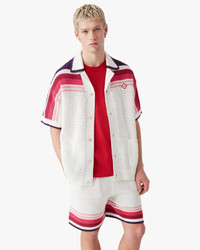 The white and pink short-sleeve shirt is a refined crochet design featuring the house's signature diamond logo and pink and burgundy stripe detail across the shoulders, chest and sleeves. Completed with ribbed collar, cuffs, and hem, front button closure, front patch pockets and signature gold rim pearl buttons. - Cotton crochet fabric - 100% cotton - Diamond logo patch - Colour: white/pink/burgundy - Specialised dry clean only - Made in Morocco - The model is 188cm / 6'2 and is wearing size M - - Relaxed fit - - - Exclusive to casablancaparis.com