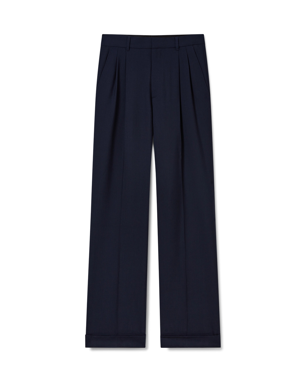 The wool tailored pleated trousers are a slim design crafted from virgin wool fabric and feature a cotton blend lining. Completed with front pleats, belt loops, zip closure, slanted side pockets, and welt back pockets. - Virgin wool fabric - Main: 100% virgin wool - Lining: 52% viscose 48% cotton - Colour: navy - Specialised dry clean only - Made in Portugal - Fits true to size, take your regular size - The model is 187cm/6'1 and is wearing a size M