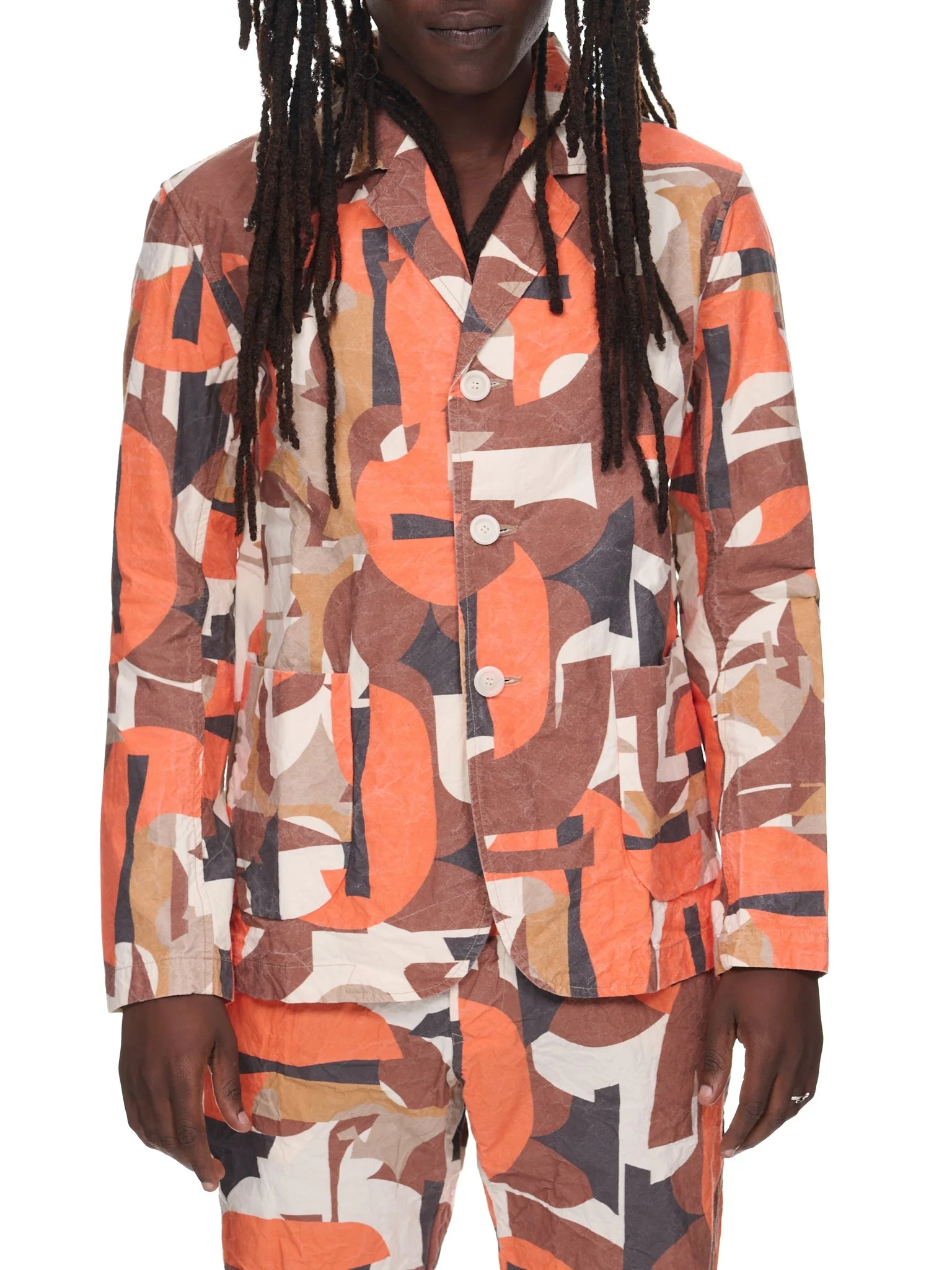 CASEY CASEY jacket in orange brown, signature patina design, mosaic pattern, lapel collar, button closure, patch pockets, back vent, fully lined, regular fit. Made in France Standard Sizing 100% Cotton Model is 6’0” wearing size S. Shoulders: 18” Chest: 33” Waist: 28”