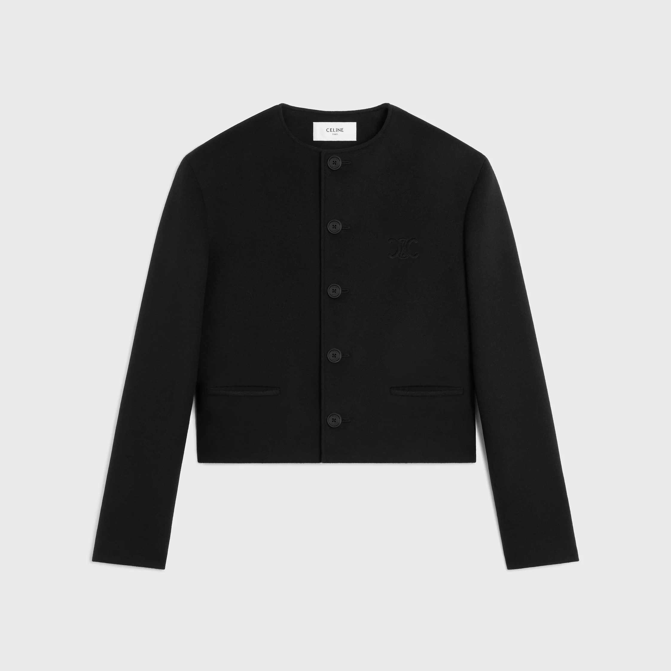 DETAILS 100% WOOL TRIOMPHE EMBROIDERY LOOSE FIT PURE COLLAR 2 WELT POCKETS 5 CELINE PARIS-ENGRAVED HORN BUTTONS 4 CELINE PARIS-ENGRAVED HORN BUTTONS ON THE CUFFS MADE IN ITALY REFERENCE : RV0PC998K.38NO