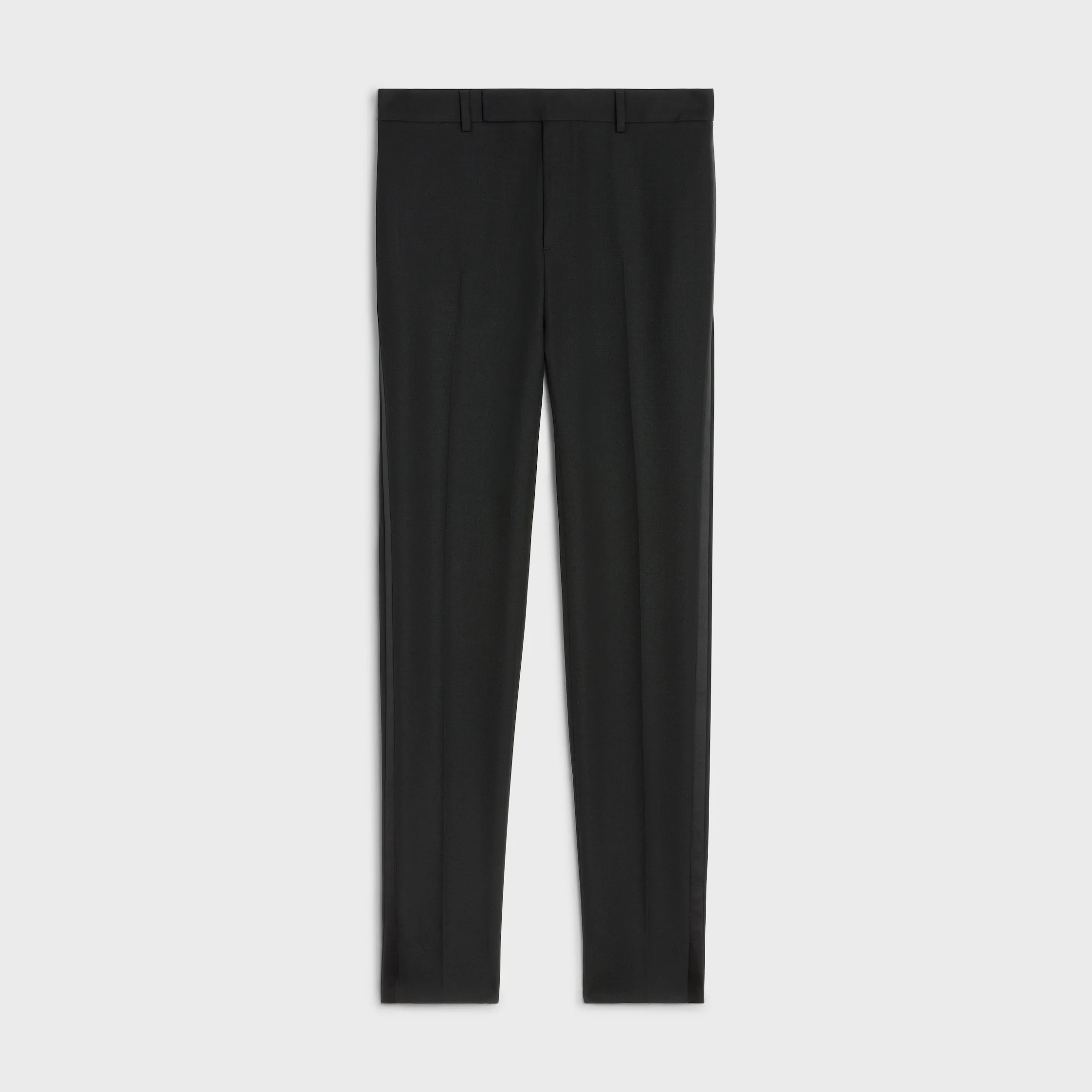 CLASSIC PANTS WITH TUX DETAILS IN GRAIN DE POUDRE WOOL DETAILS 100% WOOL SECONDARY MATERIAL 100% POLYESTER CLASSIC FIT MID-RISE FLARED LEG 2 SIDE POCKETS 2 WELT POCKETS WITH HORN BUTTON ON THE BACK SATIN SIDE BANDS ZIP AND HOOK-AND-EYE CLOSURE MADE IN ITALY REFERENCE : 2P096043R.38NO