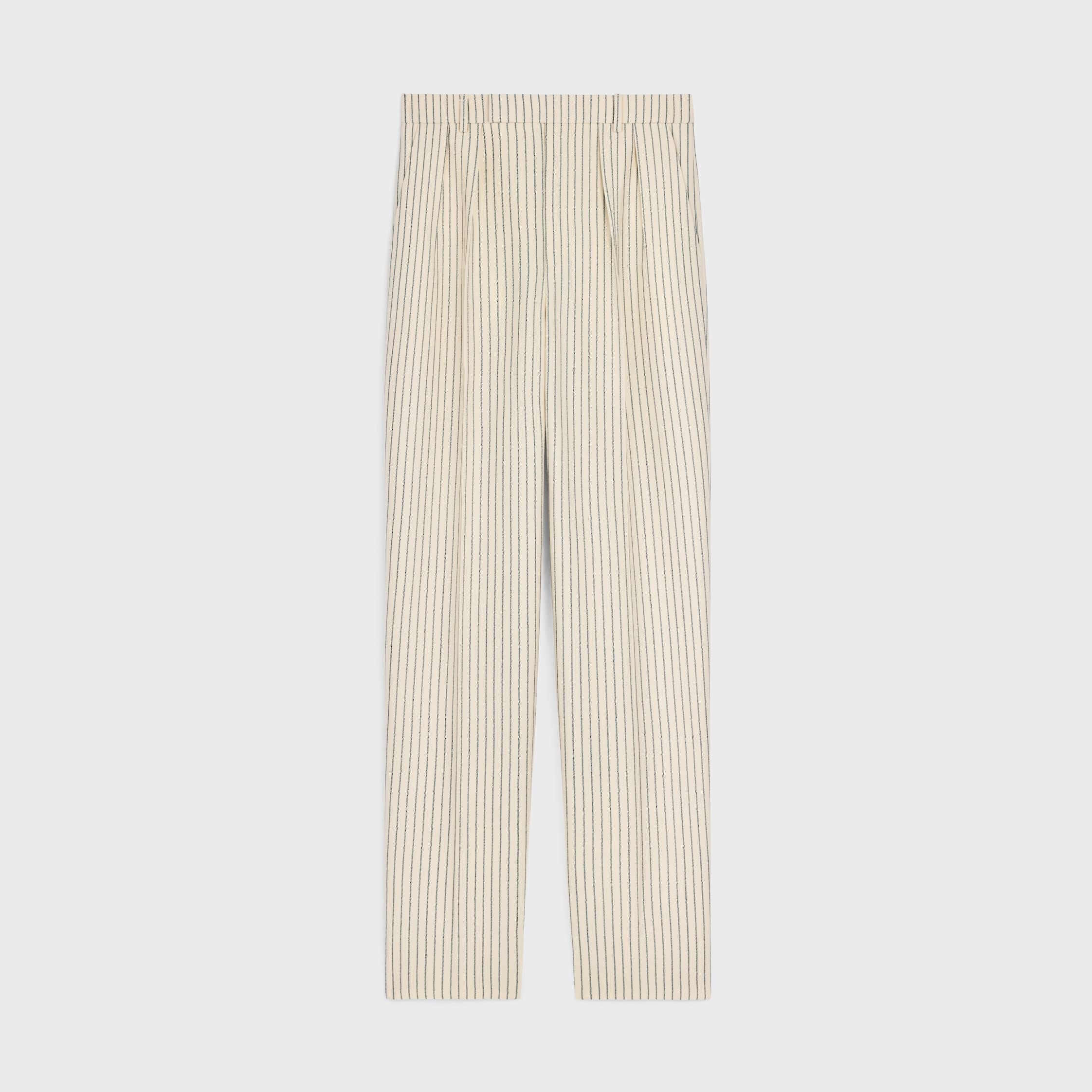 KEITH PANTS WITH 2 PLEATS IN STRIPED WOOL GABARDINE DETAILS 100% WOOL LINING 52% VISCOSE 48% CUPRO CLASSIC FIT HIGH-WAISTED STRAIGHT LEG 2 SIDE POCKETS 2 WELT POCKETS WITH HORN BUTTON ON THE BACK ZIP AND HOOK-AND-EYE CLOSURE MADE IN ITALY REFERENCE:RP0310A50.01VU