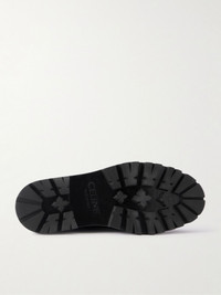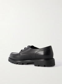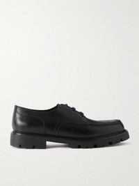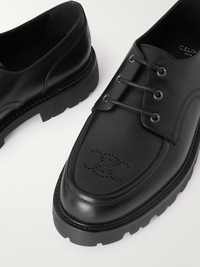 CELINE HOMME's leather Derby shoes are perforated in the shape of the 'Triomphe' motif at the toes. They're debossed with the brand name across the heel counters and have chunky, rubber-lug soles for optimal traction. Details & Care - Black leather (Bull) - Lace-up