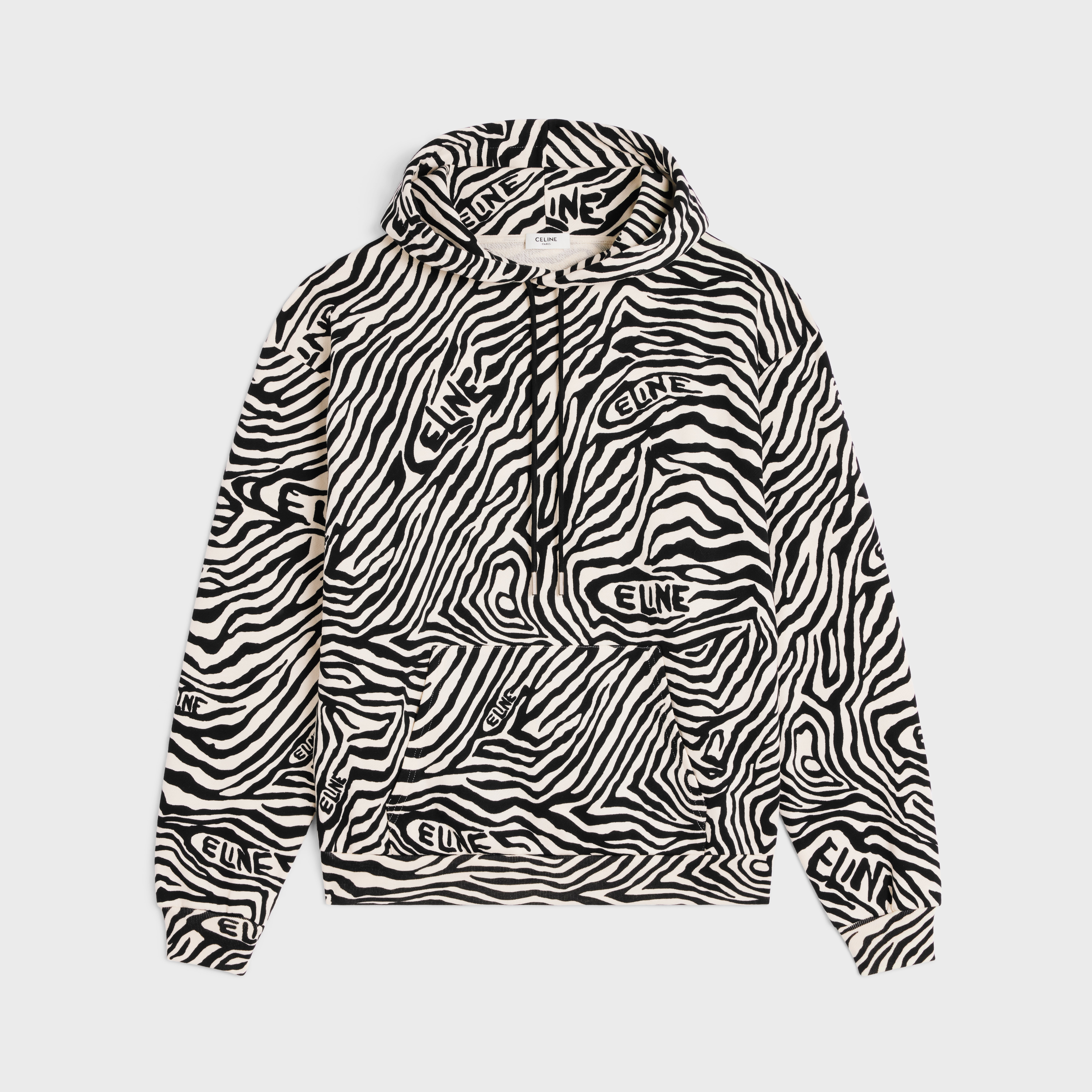LOOSE FIT HOODIE IN COTTON FLEECE WITH CELINE ZEBRA PRINT DETAILS 100% COTTON LOOSE FIT HOODED CREW NECK WITH ADJUSTABLE DRAWSTRING AND “CELINE PARIS”-ENGRAVED METAL AGLETS RIBBED TRIM 1 KANGAROO POCKET MADE IN ITALY REFERENCE : 2Y965427S.01OB