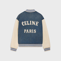 LOOSE TRIOMPHE TEDDY IN TRAIL WASH DENIM DETAILS 100% COTTON LINING 100% VISCOSE PADDING 100% POLYESTER TRAIL WASH TRIOMPHE PATCH ON THE CHEST CELINE PARIS PATCH ON THE BACK LOOSE FIT TWO-TONE TEDDY COLLAR LEATHER SLEEVES 2 DIAGONAL WELT POCKETS TWO-TONE RIBBED TRIM 7 CELINE JEANS-ENGRAVED SNAP BUTTONS REFERENCE:RV0KB789D.08TI
