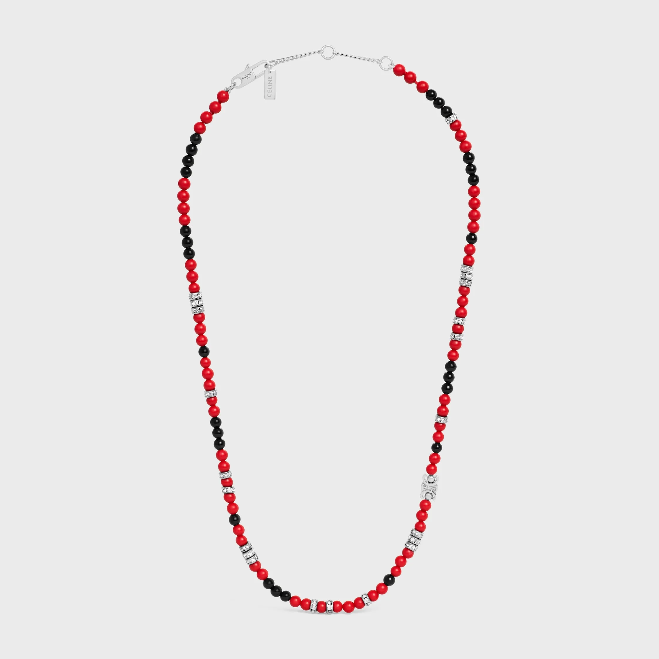 DETAILS TOTAL LENGTH 19.3 IN (49 CM) ADJUSTABLE TO 18.5 IN (47 CM) ADDITIONAL ADJUSTEMENT RING AT 17.7 IN (45 CM) ONYX, RESIN PEARLS, STRASS AND BRASS NICKEL FREE ENGRAVED CELINE PARIS SIGNATURE SNAP HOOK REFERENCE : 461OT6OGB.27SR