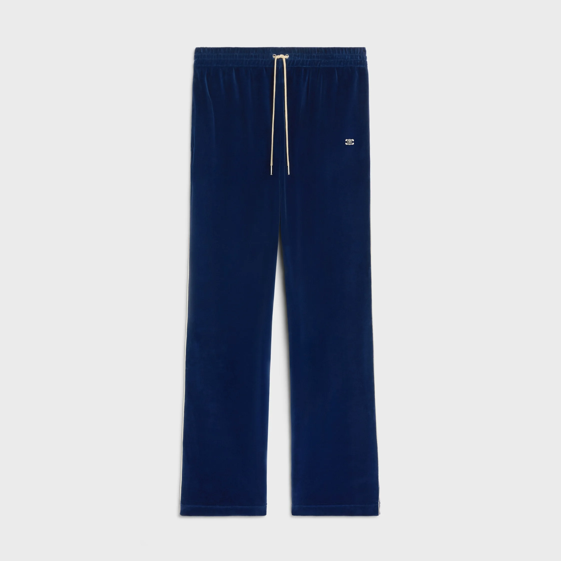 DETAILS 80% COTTON 20% POLYAMIDE TRIOMPHE EMBROIDERY LOOSE FIT MID-RISE 2 SIDE POCKETS CONTRASTING PIPING ON THE SIDES ELASTICATED WAISTBAND WITH ADJUSTABLE DRAWSTRING AND CELINE PARIS-ENGRAVED METAL AGLETS MADE IN ITALY