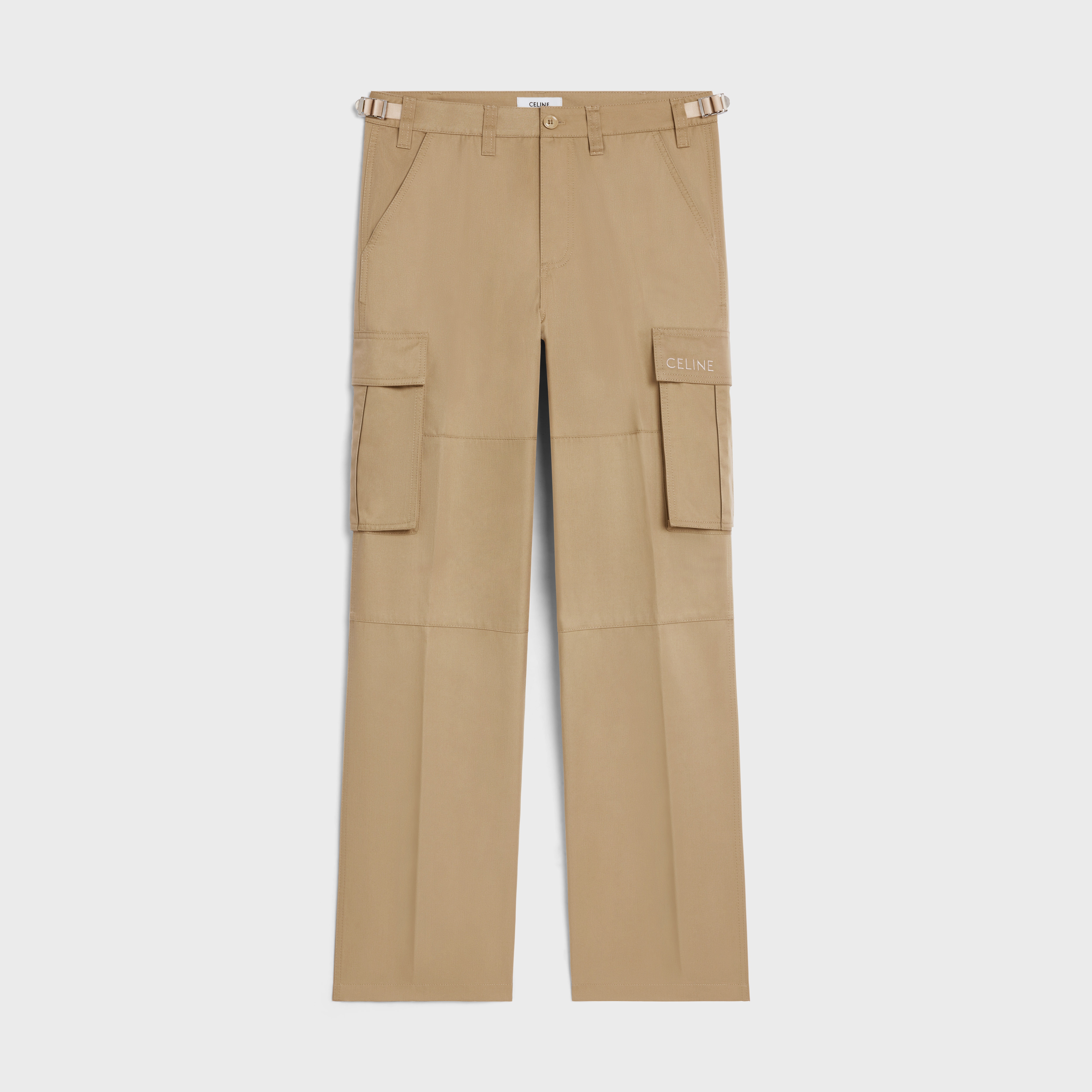 MID-RISE CARGO PANTS WITH CELINE EMBROIDERY IN TECHNICAL COTTON DETAILS 65% POLYESTER 35% COTTON CELINE EMBROIDERY ON THE SIDE POCKETS LOOSE FIT MID-RISE 2 SIDE POCKETS 2 FLAP POCKETS ON THE BACK 2 PATCH POCKETS WITH FLAP ON THE SIDE OF THE LEG WITH CELINE SNAP BUTTONS CELINE ADJUSTMENT TABS ON THE WAIST AND CELINE METAL BUCKLE CELINE PARIS-ENGRAVED ZIP AND BUTTON MADE IN ITALY REFERENCE : RP011004N.02BG