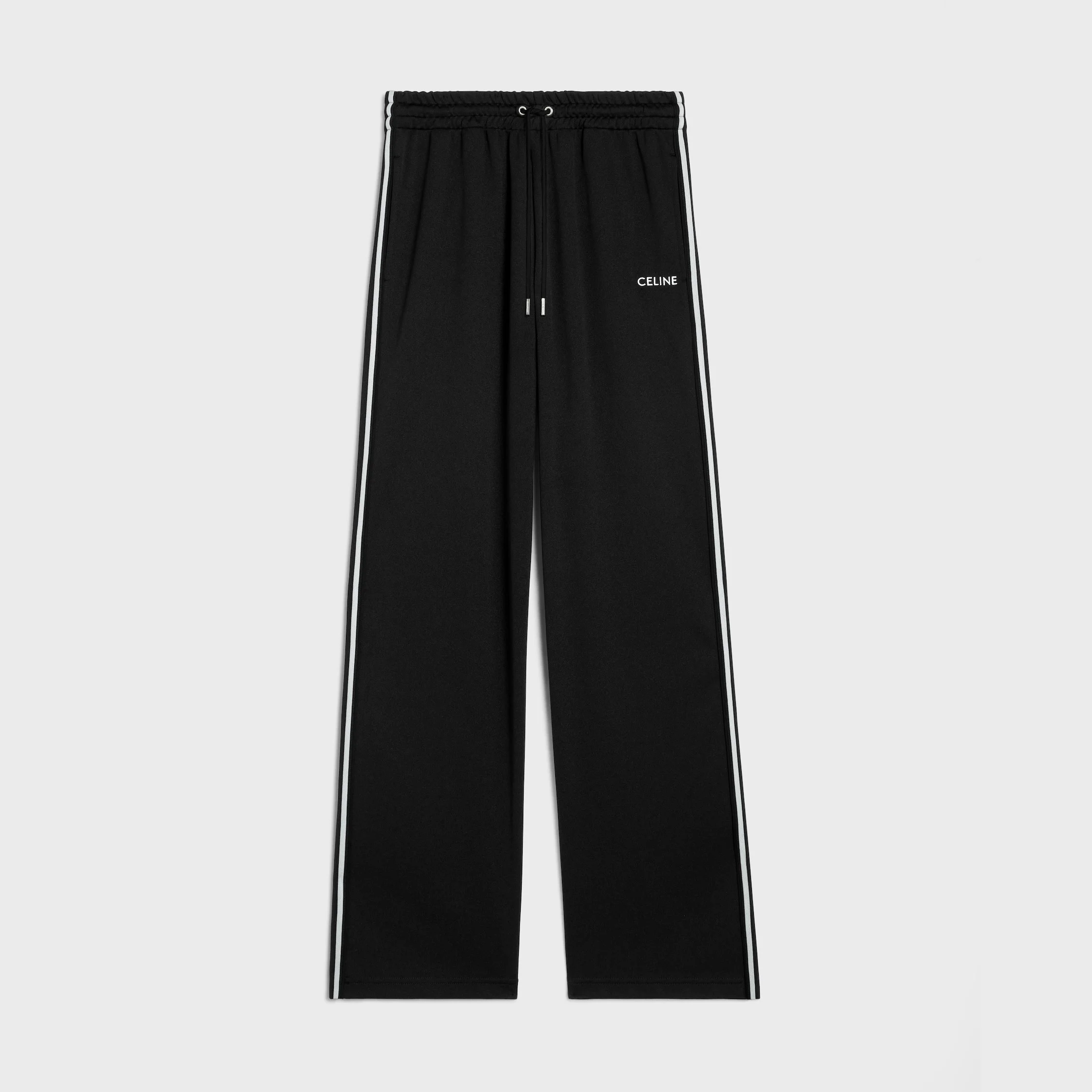 TRACKSUIT PANTS WITH CELINE EMBROIDERY IN DOUBLE FACE JERSEY DETAILS 100% POLYESTER CELINE EMBROIDERY CLASSIC FIT MID-RISE 2 SIDE POCKETS CONTRASTING SIDE BANDS ELASTICATED WAISTBAND WITH ADJUSTABLE DRAWSTRINGS AND CELINE-ENGRAVED METAL AGLETS MADE IN ITALY REFERENCE : 2Z412121O.38AW