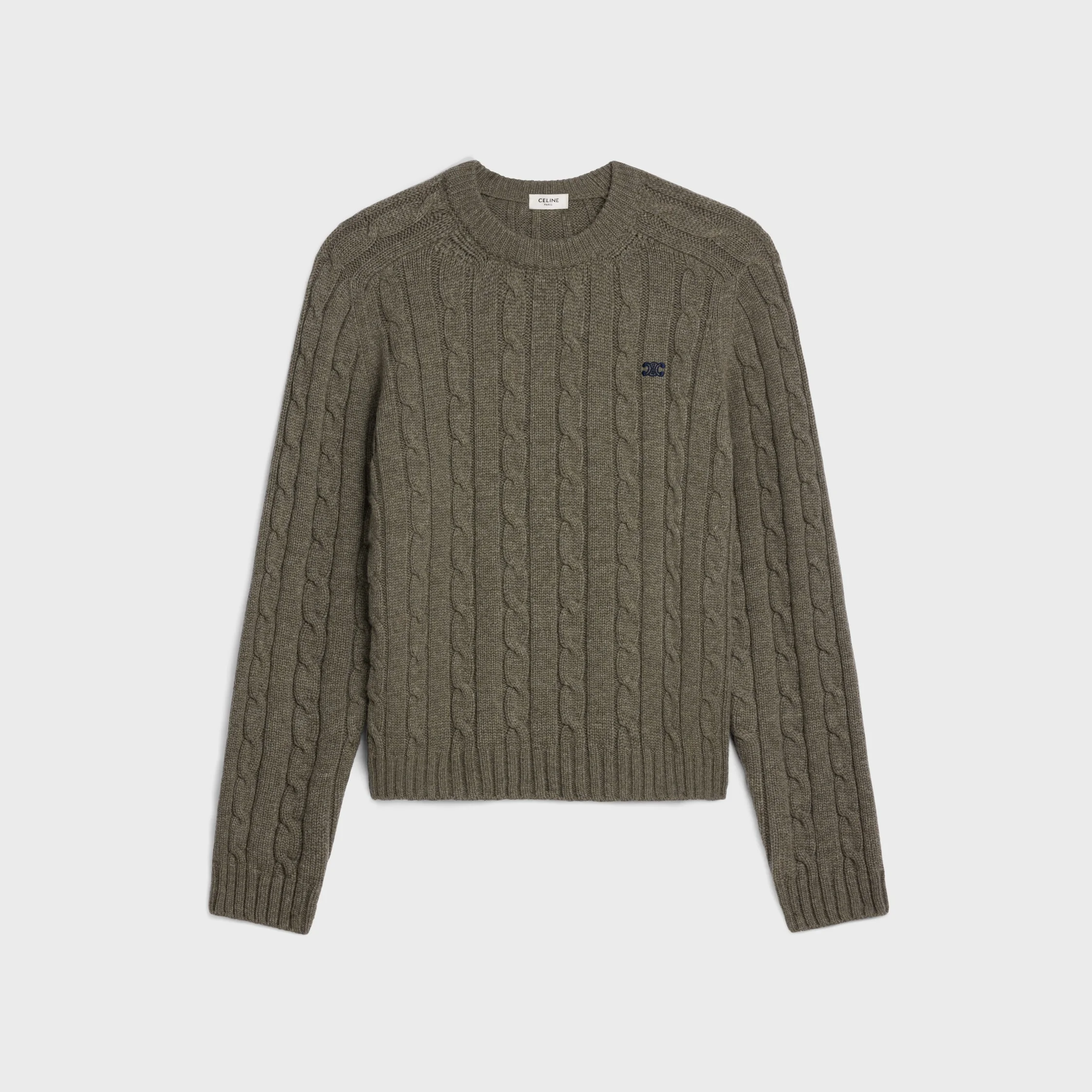 CABLE-KNIT TRIOMPHE CREW NECK SWEATER IN CASHMERE DETAILS 100% CASHMERE LEATHER MATERIAL 100% GOATSKIN TRIOMPHE EMBROIDERY CLASSIC FIT CREW NECK LONG RAGLAN SLEEVES RIBBED TRIM 2 SUEDE ELBOW PATCHES MADE IN ITALY REFERENCE : 2AD4G362W.03MB