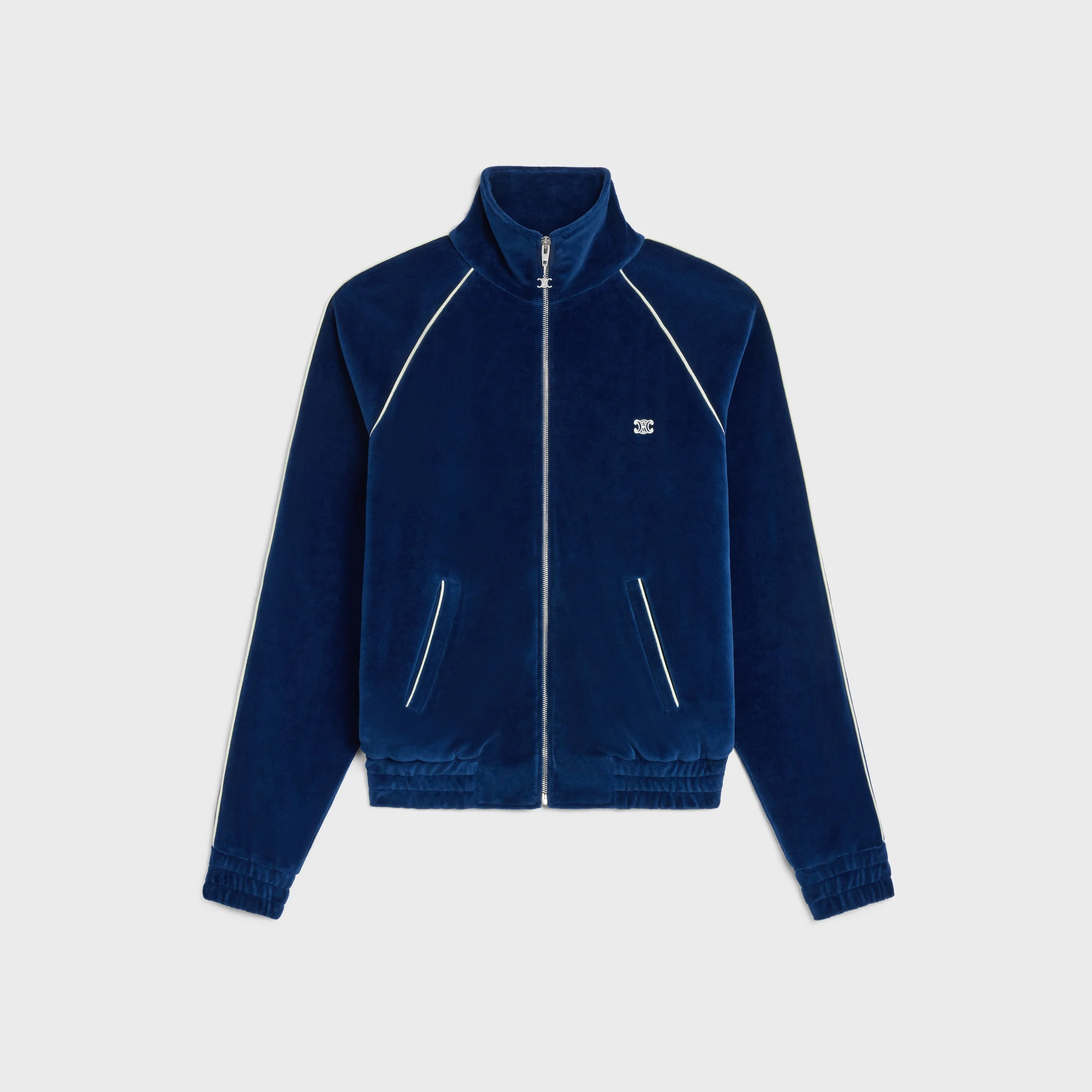 DETAILS 80% COTTON 20% POLYAMIDE LINING 52% VISCOSE 48% CUPRO TRIOMPHE EMBROIDERY CLASSIC FIT HIGH COLLAR LONG RAGLAN SLEEVES WITH CONTRASTING PIPING 2 DIAGONAL WELT POCKETS WITH CONTRASTING PIPING ELASTICATED CUFFS AND SLEEVES ZIP CLOSURE WITH TRIOMPHE TASSEL MADE IN ITALY REFERENCE : RV029748Q.07PM