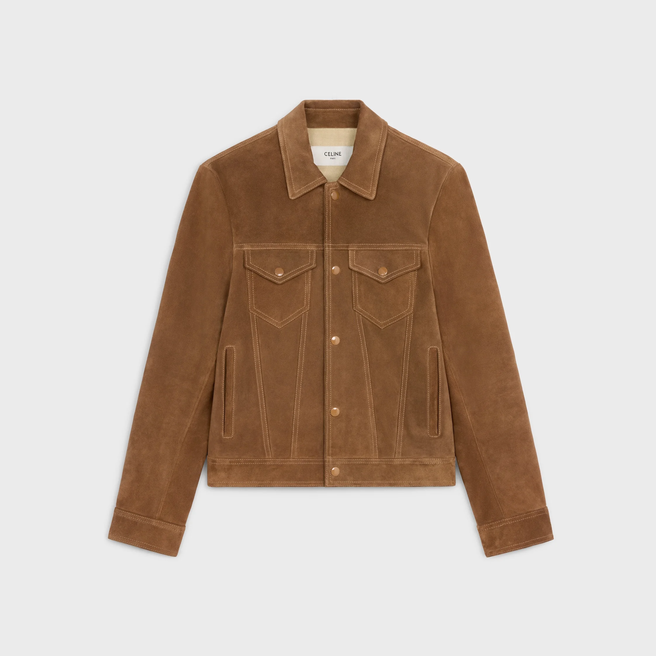 TRUCKER JACKET IN SPLIT CALFSKIN DETAILS 100% SUEDE CALF LEATHER LINING 70% CUPRO 30% COTTON CLASSIC FIT SHIRT COLLAR 2 FLAP PATCH POCKETS ON THE CHEST 2 DIAGONAL WELT POCKETS 2 ADJUSMTENT TABS ON THE WAIST 5 CELINE-ENGRAVED SNAP BUTTONS 1 CELINE-ENGRAVED SNAP BUTTON ON THE CHEST POCKET 1 CELINE-ENGRAVED SNAP BUTTON ON THE CUFFS 1 CELINE-ENGRAVED SNAP BUTTON ON THE ADJUSTMENT TAB REFERENCE:2EJ74039F.14CI
