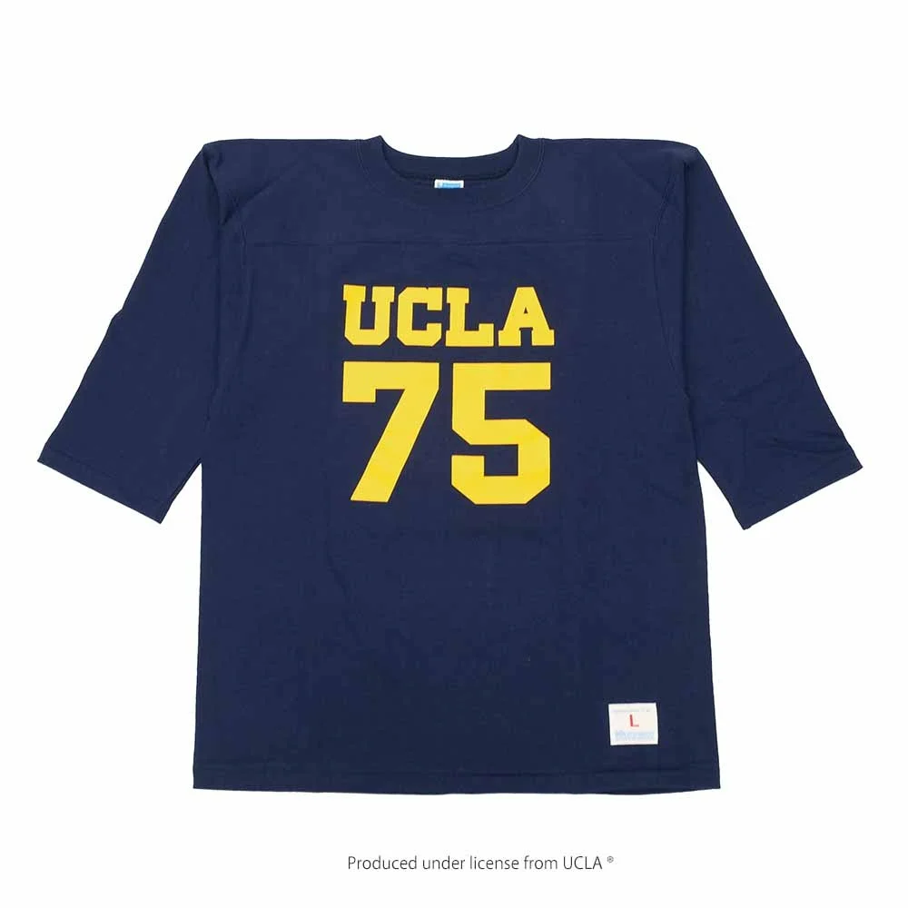 - This 3/4-sleeve football T-shirt is a reproduction of the "Champion" football T-shirt developed as campus wear in the 1960s. The football T-shirts of the time were made of thinner fabric than those developed for practice wear, but the shoulders were double-layered to increase strength, and the early models had elbow patches. This product is a reproduction of the early model with elbow patches and reinforced shoulder yokes with two-needle stitching. The graphics follow the design with the university's name and graduation year number, which was sold at the university's bookstore at the time. The prints are three types: officially licensed “UCLA,” “Michigan State University,” and “Yale University” on the front. The C logo patch on the left sleeve is not attached, which is also a reproduction of the specifications of those days. - 100% Cotton - Made in Japan - Model Wearing Size: M (Height 170cm / Weight 52kg)