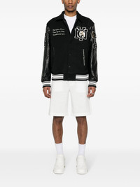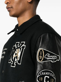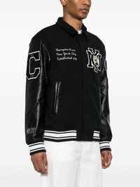 logo-patch bomber jacket Highlights - Black/white - Panelled design - Classic collar - Long sleeves - Ribbed cuffs and hem - All-over logo patches - Two side slit pockets - Full lining - Straight hem - Front press-stud fastening Imported Composition Outer: Polyester 70%, Viscose 30% Lining: Polyamide 100% SIZE & FIT Model measurements Height 6 ft 2 in(1.87 m) Bust/Chest 38.18 in(97 cm) Hips 36.61 in(93 cm) Waist 29.13 in(74 cm) FittingInformation Designed to be unstructured, offering a loose fit throughout The ribbed hem offers a close, comfortable fit Made from a midweight non-stretch fabric This piece fits true to size – take your usual size
