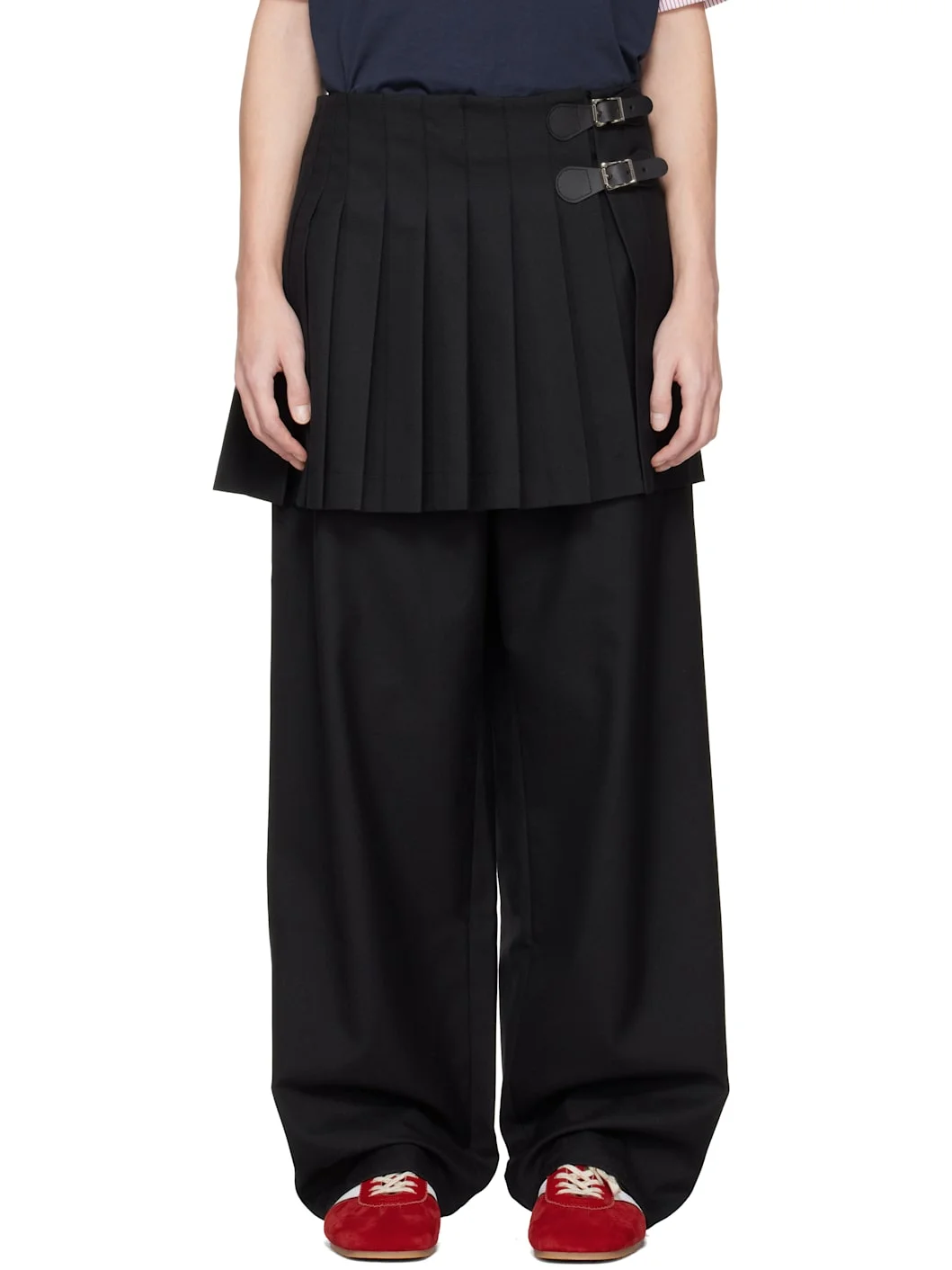 Wool-blend twill trousers. · Integrated pleated skirt-style overlay · Adjustable pin-buckle tabs at front · Two-pocket styling · Zip fly Supplier color: Black 55% polyester, 45% wool. Made in Lithuania 252101M191002