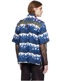 Plain-woven linen shirt. Graphic pattern printed throughout. · Modified spread collar · Button closure · O-ring strap detail at front and back · Flap pockets · Epaulettes · Vented side seams · Wood hardware Supplier color: Blue runners
