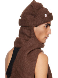 Rib-knit stretch alpaca-blend beanie. · Exposed seams throughout · Ear appliques at crown · Logo patch at rolled brim · Concealed logo hardware at back face · Integrated scarf-style panel with fringed ends Supplier color: Brown 59% alpaca, 24% viscose, 9% polyester, 7% nylon, 1% elastane. Made in South Korea 252101M150002