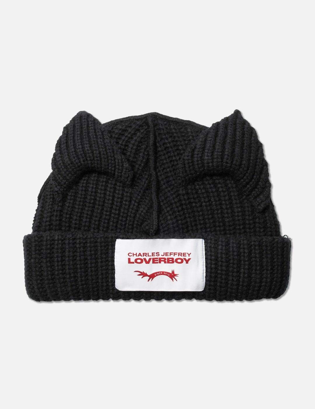 - Charles Jeffrey Loverboy - Chunky Ears Beanie - Made with a blend of Responsible Wool Standard lambswool - Knitted construction - Bunny ear detail - Logo patch - Color: Black - Material: 80% RWS Lambswool, 20% Recycled Nylon - See more Beanies, Hats and Accessories SIZING Approximate dimensions: - Crown Height: 21cm - Circumference: 52cm