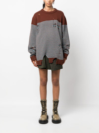 distressed striped jumper Charles Jeffrey Loverboy brings a contemporary flair and twist to each design. This striped jumper is defined by the intense distressed effect. Highlights - Blue/brown - Wool blend - Horizontal stripe pattern - Distressed finish - Round neck - Long sleeves - Ribbed hem - When buying this unisex item, keep in mind that it is graded in standard men's sizing. Imported Composition RWS Wool 80%, Recycled Nylon 20% SIZE & FIT Model measurements Height 5 ft 10 in(1.77 m) Bust/Chest 31.88 in(81 cm) Hips 36.22 in(92 cm) Waist 24.01 in(61 cm) Measurement CHEST 46.45 in(118 cm) SLEEVE LENGTH 25.98 in(66 cm) LENGTH 27.55 in(70 cm) Shoulder Width 17.32 in(44 cm) FittingInformation This piece is unisex – if you usually select men's sizing expect a loose fit throughout; if you usually select women's sizes, expect an oversized fit Made with a midweight knit, this piece offers some stretch