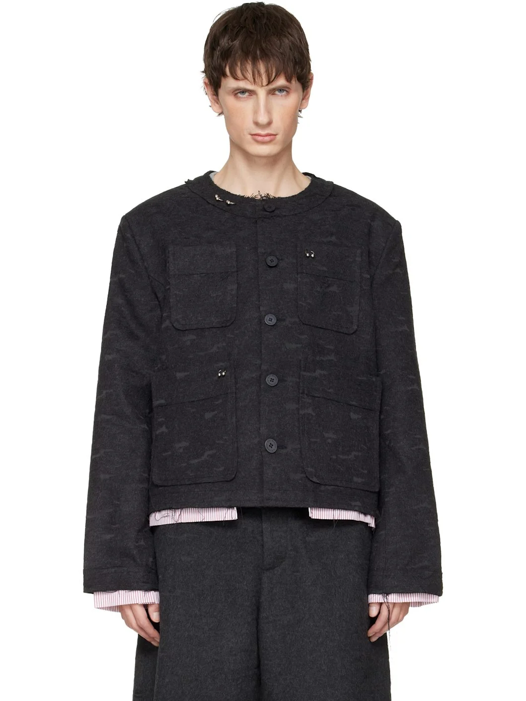 Flannel jacket. · Distressing throughout · Raw edge at band collar, hem, and cuffs · Button closure · Hoop hardware at front · Patch pockets at front · Padded shoulders · Inset striped poplin cuffs · Full striped cotton poplin lining Supplier color: Grey Body: 52% polyester, 34% acrylic, 14% wool. Lining: 100% cotton. Made in Lithuania 252101M180000