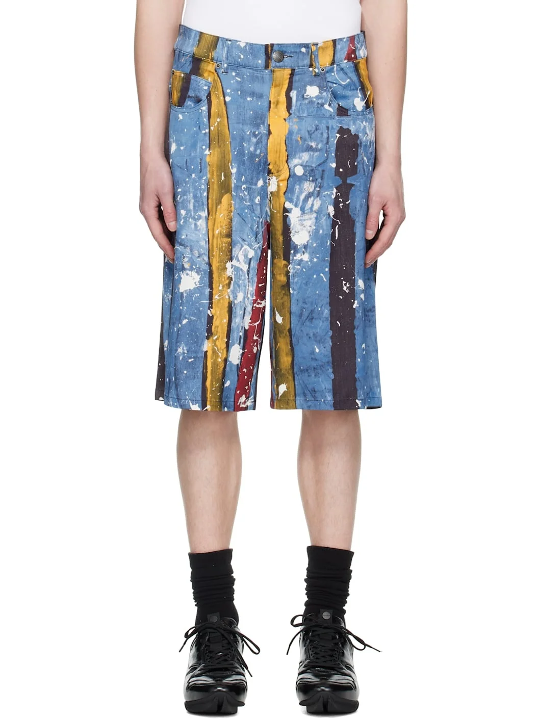 Stretch viscose twill shorts. Stripes, paint splatter, and trompe l'oeil denim pattern printed throughout. · Belt loops · Five-pocket styling · Zip fly · Leather logo patch at back waistband · Logo flag at back pocket · Logo-engraved gunmetal-tone hardware Supplier color: Painted stripe 95% viscose, 5% elastane. Made in Portugal 251101M193002