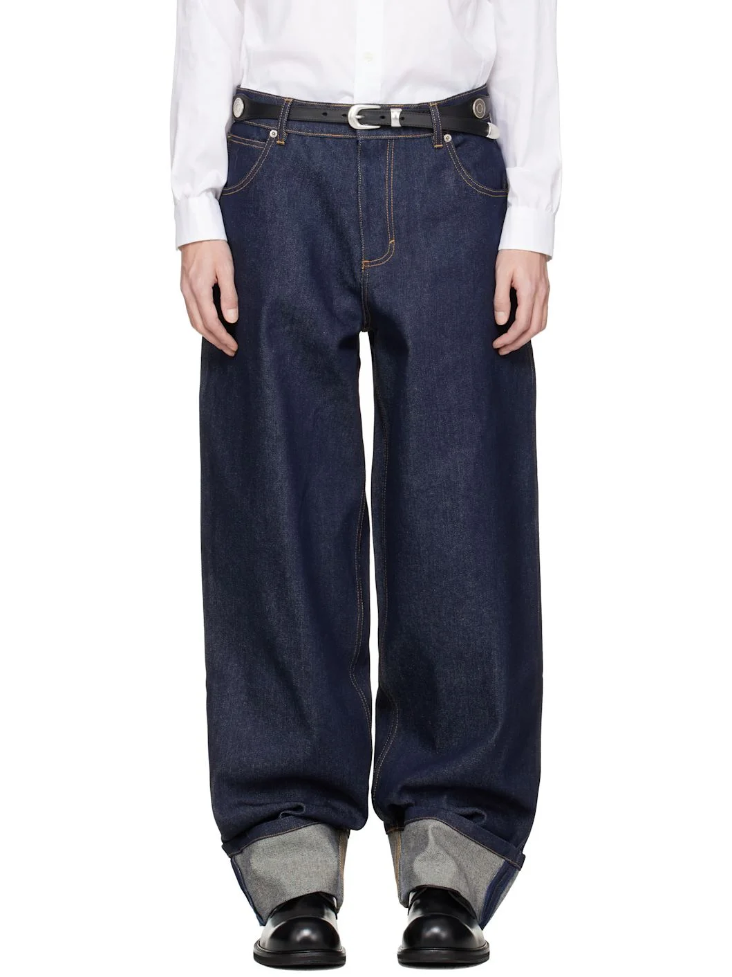Non-stretch denim jeans. · Belt loops · Five-pocket styling · Zip fly · Rolled cuffs · Logo patch at back waistband · Knit mohair-blend ear appliques at back pocket · Logo-engraved gunmetal-tone hardware · Contrast stitching in tan Supplier color: Indigo denim Body: 100% cotton. Trim: 49% kid mohair, 32% lambswool, 19% nylon. Made in Portugal 252101M186000