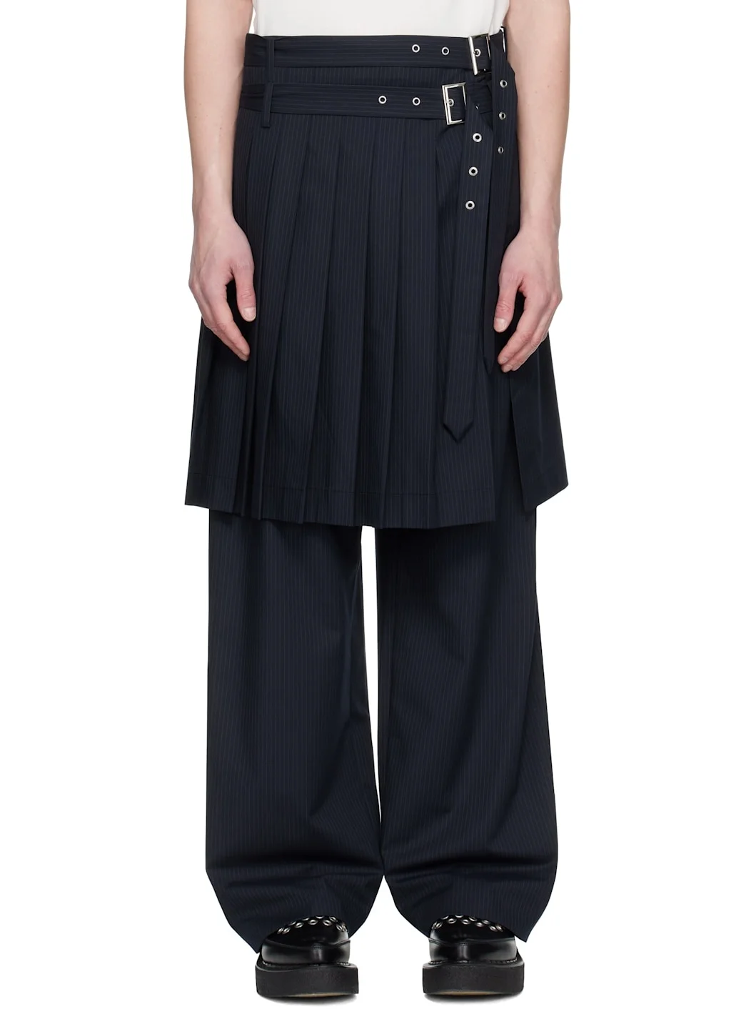 Wide-leg stretch recycled polyester-blend twill trousers. Pinstripes throughout. · Layered construction · Belt loops and detachable pin-buckle belts · Two-pocket styling · Zip fly · Pleats and vent at skirt-style overlay Supplier color: Navy pinstripe 64% recycled polyester, 33% viscose, 3% elastane. Made in Bulgaria 251101M191000