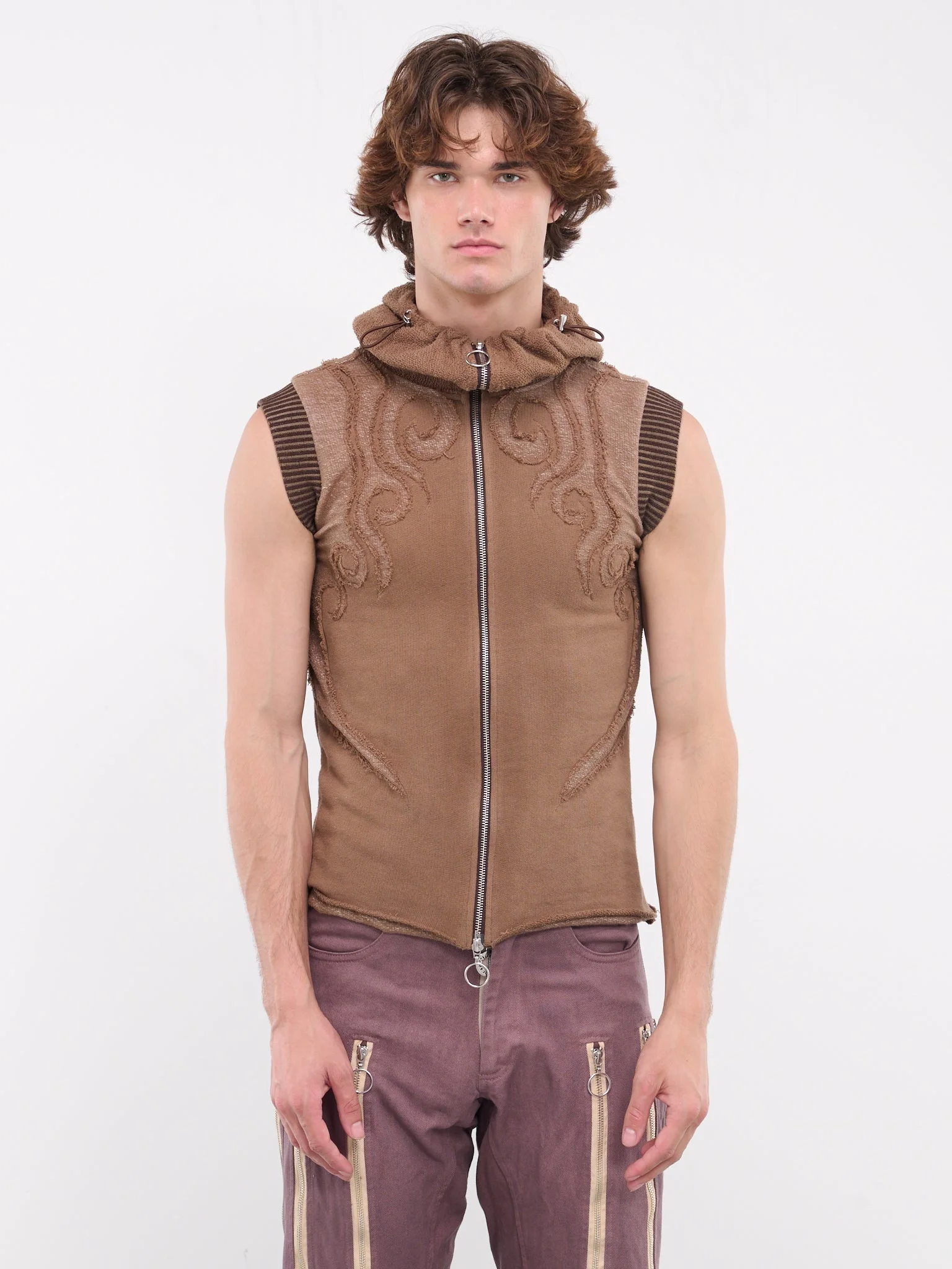 CHARLIE CONSTANTINOU vest in brown, paneled jersey construction, graphic appliqué detailing, raw hems, hood, high neck, adjustable bungee-style drawstring, front exposed two-way zip closure, sleeveless, striped armscyes, straight hem, slim fit. Standard Sizing Model is 6'2" wearing size M. Shoulders: 19" Chest: 38" Waist: 31"