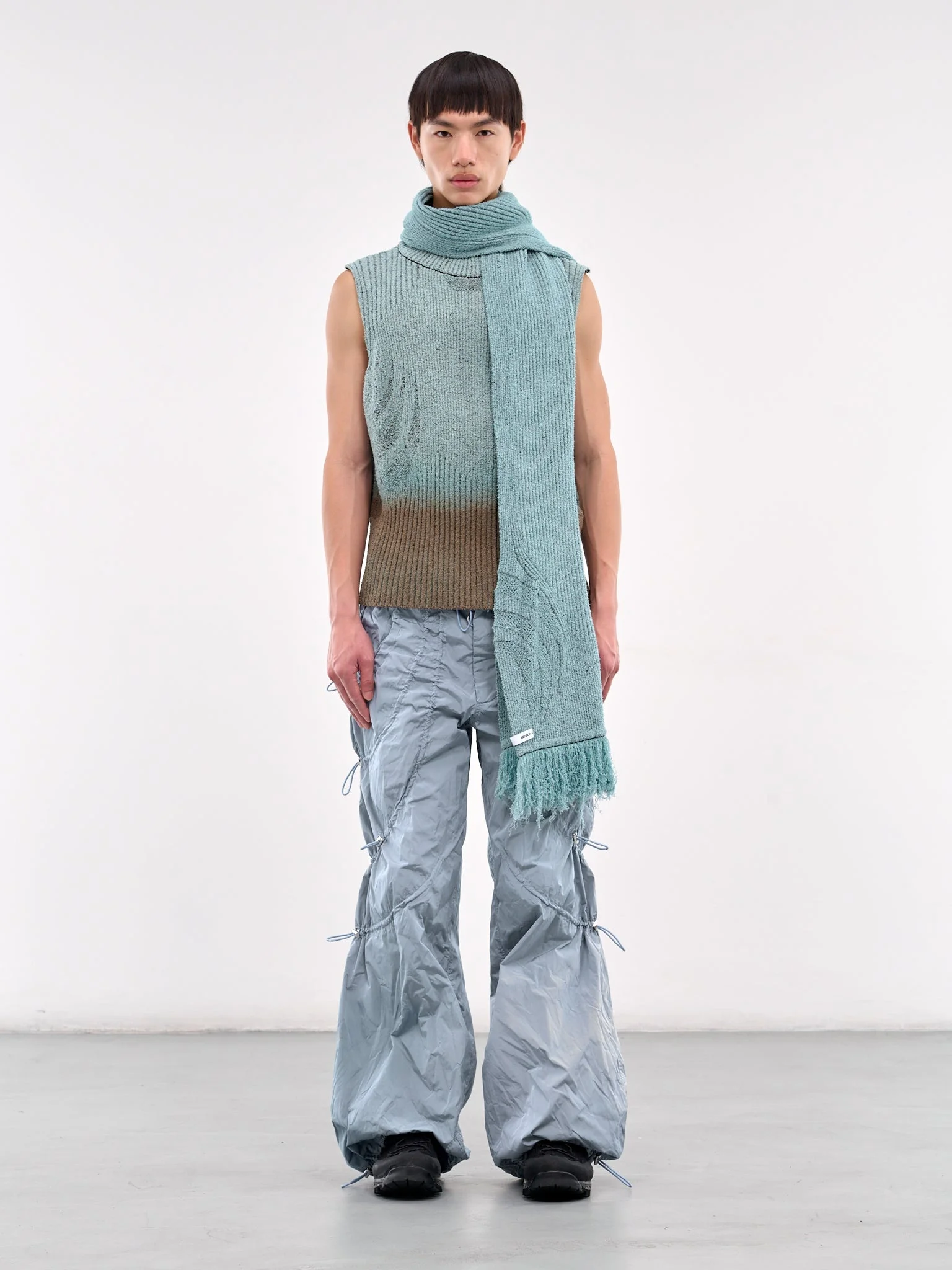 CHARLIE CONSTANTINOU sweater vest in green & brown, paneled knit construction, gradient dye, jacquard knit pattern, rib-knit, scarf collar, fringed scarf, sleeveless, armscyes, straight hem, relaxed fit. Standard Sizing Model is 6'1" wearing size M. Shoulders: 18" Chest: 36" Waist: 30"