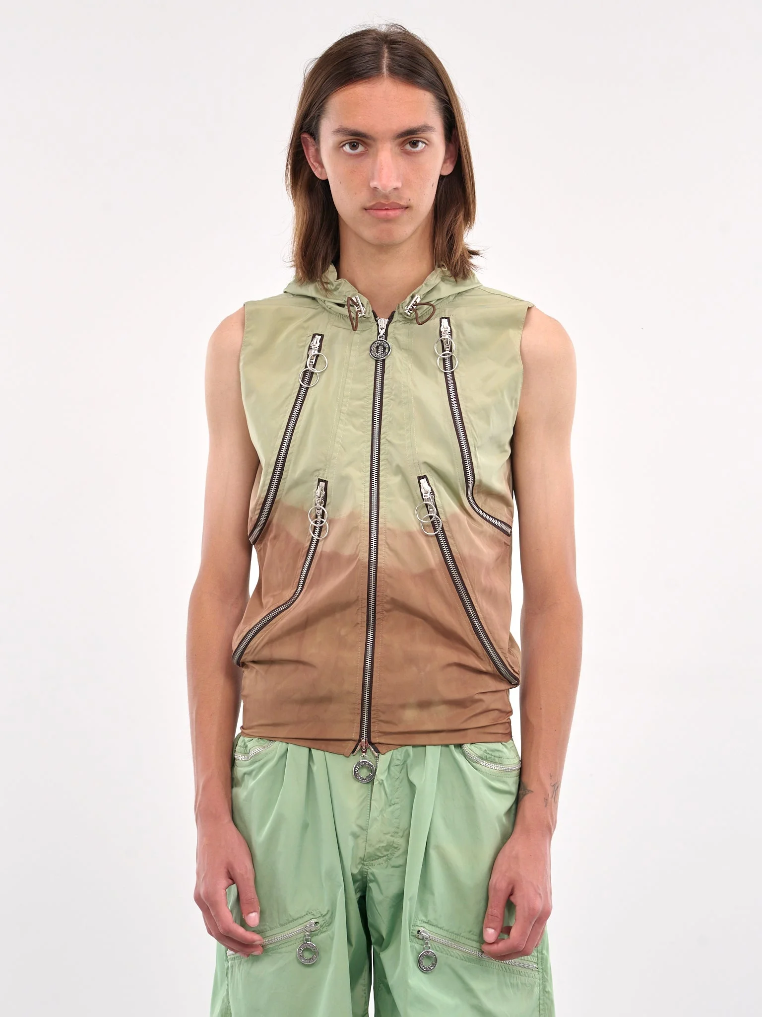 CHARLIE CONSTANTINOU vest in green & brown, paneled construction, gradient dye, hood, adjustable bungee drawcord, front exposed two-way zip closure, sleeveless, armscyes, side zip pockets, signature logo-engraved zip pulls, straight hem, slim fit. Standard Sizing Model is 6'2" wearing size M. Shoulders: 19" Chest: 38" Waist: 29"