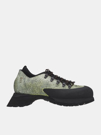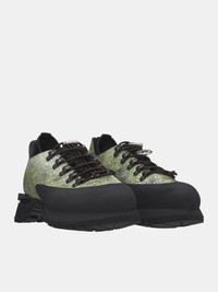 DEMON x CHARLIE CONSTANTINOU shoes in green & black, handcrafted, vegetable-tanned leather upper, waterproof, embossed logo, eFoam protected round toe, reflex sock webbing, stretch nylon sock lining, speed lace fastening, removable space-shell footbed, extra light Vibram rubber sole. Made in Italy European Sizing