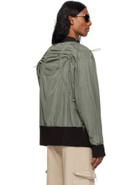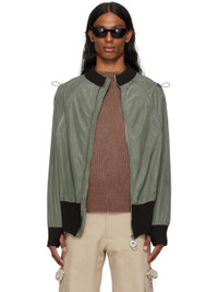 Hand-dyed crinkled nylon taffeta jacket. · Lightweight · Rib-knit stand collar, hem, and cuffs · Two-way zip closure · Two-way zip vents at front · Concealed zip and patch pockets · Bungee-style drawstring at shoulders and back · Dropped shoulders · Thumbhole at cuffs · Fully lined · Logo-engraved silver-tone hardware Each item is unique. Please note coloration may vary. Available exclusively at SSENSE. Supplier color: Graphite green Body: 100% polyamide. Trim: 60% merino wool, 30% viscose, 10% polyester. Made in United Kingdom 251785M175000